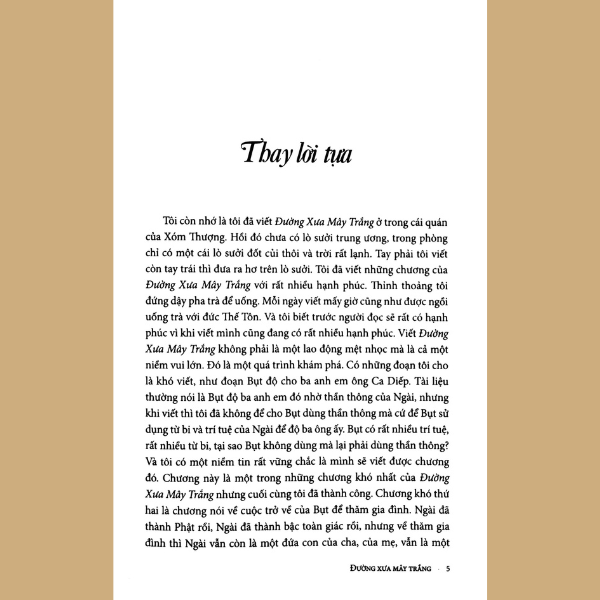 Tôi đã viết những chương của Đường Xưa Mây Trắng với rất nhiều hạnh phúc. Thỉnh thoảng tôi đứng dậy pha trà để uống. Mỗi ngày viết mấy giờ cũng như được ngồi uống trà với Đức Thế Tôn. Và tôi biết trước người đọc sẽ rất có hạnh phúc vì khi viết, mình cũng đang có rất nhiều hạnh phúc. Viết Đường Xưa Mây Trắng không phải là một lao động mệt nhọc mà là cả một niềm vui lớn. Đó là một quá trình khám phá.