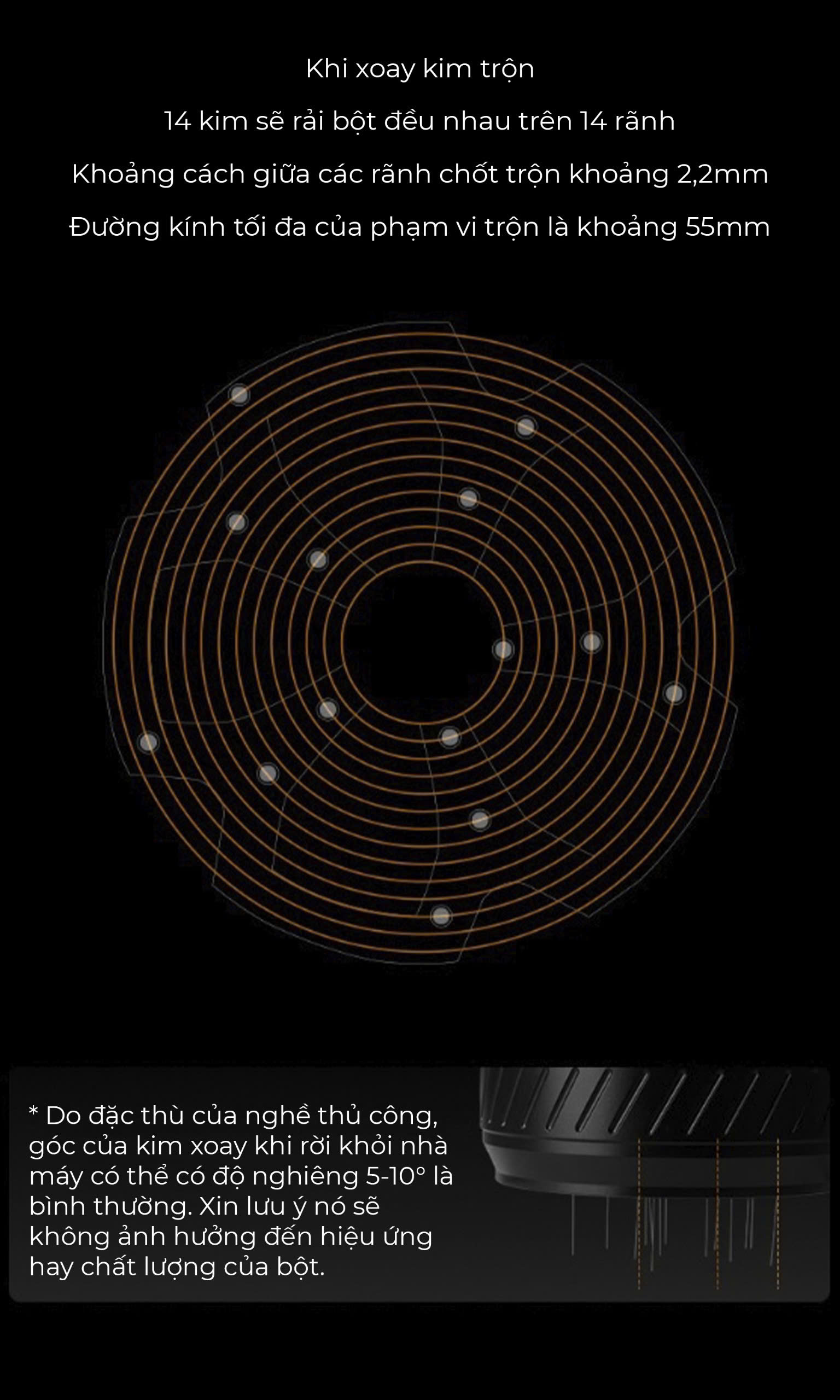 ƯU ĐIỂM NỔI BẬT CỦA SẢN PHẨM ️ Công nghệ xoắn ốc tự động xoay – Tán bột nhanh. Khi nhấn xuống, trục tự động xoay theo đường ren, giúp 14 kim phân phối bột đồng đều, tránh tình trạng bột vón cục. ️ Hệ thống 14 kim inox 304 siêu mảnh, dày 0,25mm sắp xếp theo 14 vòng tròn đồng tâm, giúp phân bổ bột tối ưu, hạn chế kênh rãnh (channeling). ️ Khoảng cách giữa các rãnh trộn: 2,2mm, phạm vi trộn tối đa: 55mm. ️ Điều chỉnh độ sâu kim linh hoạt (18 - 22mm). Xoay ngược chiều kim đồng hồ để tăng độ sâu, xoay cùng chiều để giảm. ️ Đế từ tính siêu chắc với 10 nam châm phân bổ đều, giúp cố định chắc chắn trên tay cầm 58mm, đảm bảo thao tác chính xác. ️ Thiết kế tích hợp – Không cần đế bảo quản. Kim tán được thu gọn bên trong, giúp bảo vệ sạch sẽ, không tiếp xúc với mặt bàn khi không sử dụng.