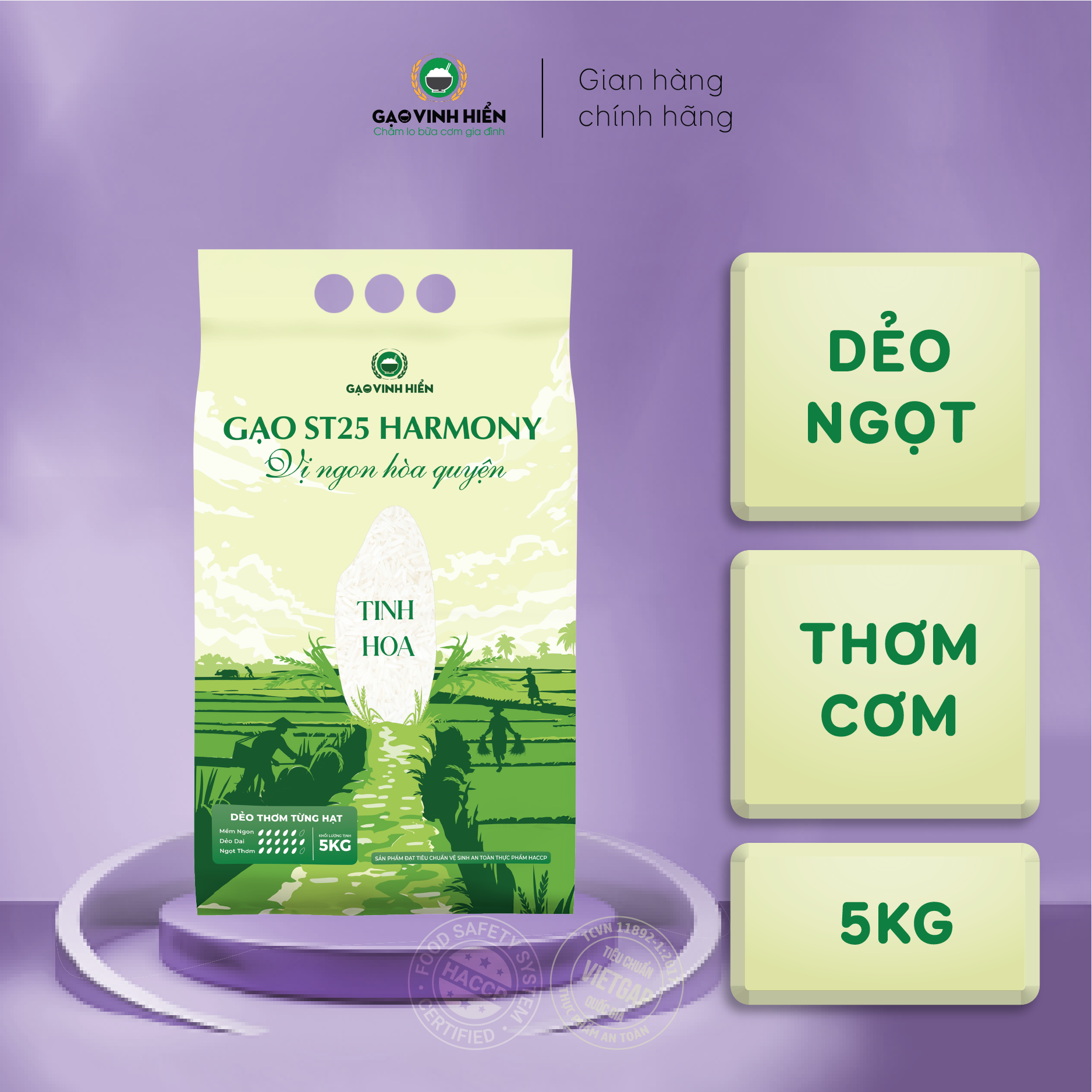 Gạo ST25 Harmony Vinh Hiển SIÊU PHẨM MỚI TRÌNH LÀNG Vị ngon hòa quyện, vị giác thăng hoa Gạo dẻo nhiều, mềm ngon Được sản xuất theo tiêu chuẩn HACCP và chuẩn VietGAP Gạo ngon