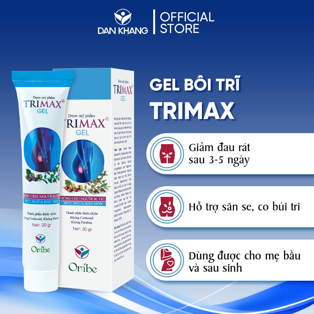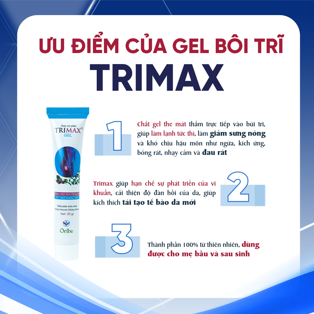 Trimax là gel bôi trĩ được kết hợp bởi các thành phần thảo mộc, an toàn và hiệu quả cho người bị trĩ. Thành phần không chứa Corticoid hay Paraben không gây hại cho người dùng. Gel Trimax được xem là giải pháp hoàn hảo và tiện lợi cho người bệnh trĩ nhằm làm giảm các triệu chứng sưng, nóng, đỏ, ngứa, đau rát khó chịu, đồng thời mang lại cảm giác dễ chịu và thoải mái cho người bệnh.