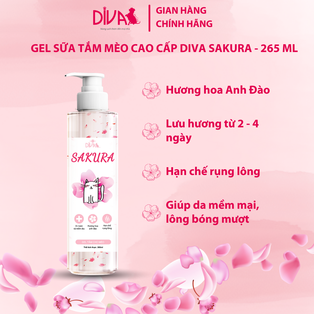 - DIVA SAKURA là sự kết hợp giữa các thảo dược thiên nhiên và cánh hoa tẩm Collagen, độ PH phù hợp với mèo, giúp da mềm mại, lông mềm mượt và hạn chế rụng lông.