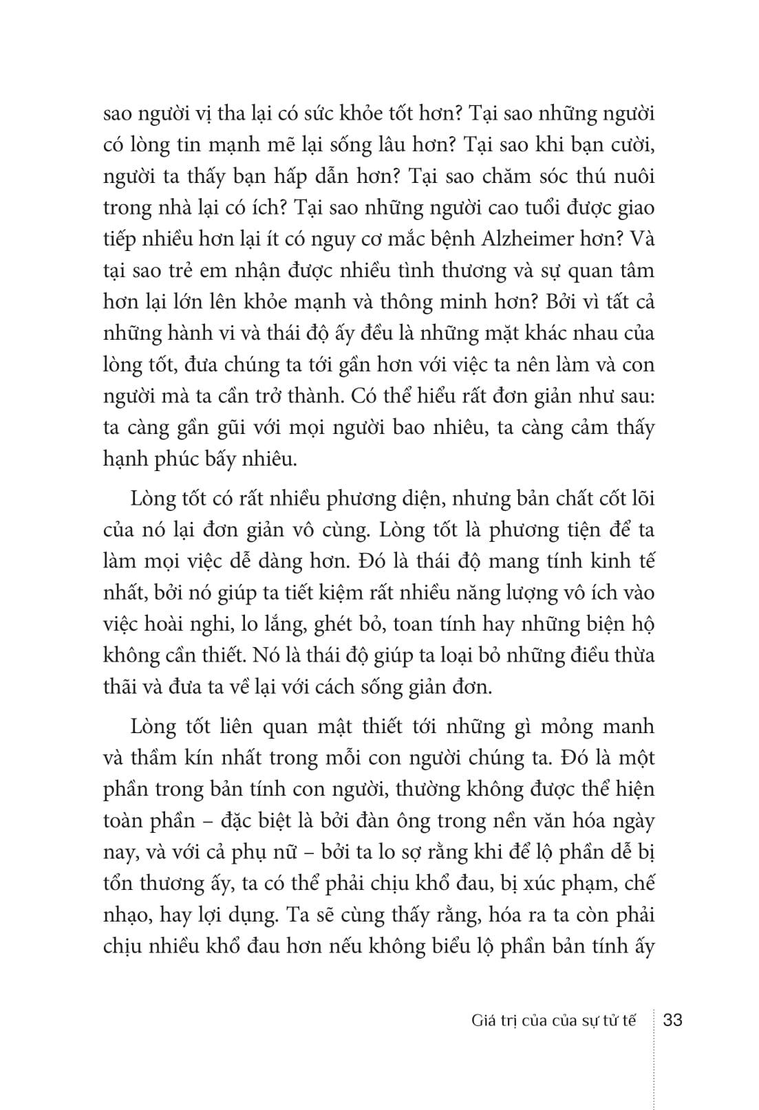 Giá Trị Của Sự Tử Tế Lòng tốt và sự đồng cảm là hai trong số nhiều điều thiết yếu khiến cuộc sống của chúng ta có ý nghĩa. Chúng là khởi nguồn cho hạnh phúc và niềm vui vĩnh cửu. Chúng là nền tảng của một trái tim nồng ấm, trái tim của người sẵn lòng dang tay giúp đỡ người khác một cách vô tư. Bằng lòng tốt, tình thương yêu, sự trung thực, chân thành và công bằng với tất cả mọi người, ta có thể bảo vệ sự tử tế. Đó là lẽ thường tình. Quan tâm tới mọi người là một việc đáng làm, bởi vì hạnh phúc của chúng ta gắn liền với hạnh phúc của những người khác. Nếu xã hội chìm trong đau khổ, bản thân chúng ta cũng đau khổ. Khi trái tim và tâm trí ta càng bị cái ác lấn át, ta càng trở nên bất hạnh. Bởi vậy, lòng tốt và sự đồng cảm là những giá trị ta không thể thiếu được. Việc cố gắng tạo ra điều gì đó tích cực trong cuộc sống là điều vô cùng quan trọng. Chúng ta không được sinh ra để gây rắc rối và làm hại người khác. Như Piero Ferrucci đã trình bày một cách đầy đủ và mạch lạc trong cuốn sách Giá trị của sự tử tế này, để cuộc sống thật sự có giá trị, ta cần củng cố và nuôi dưỡng những giá trị cơ bản của con người như sự nhiệt thành, lòng tốt và sự đồng cảm. Nếu làm được điều đó, cuộc sống của chúng ta sẽ trở nên có ý nghĩa, hạnh phúc và bình an hơn, đồng thời sẽ góp một phần tích cực vào thế giới quanh m.ình.