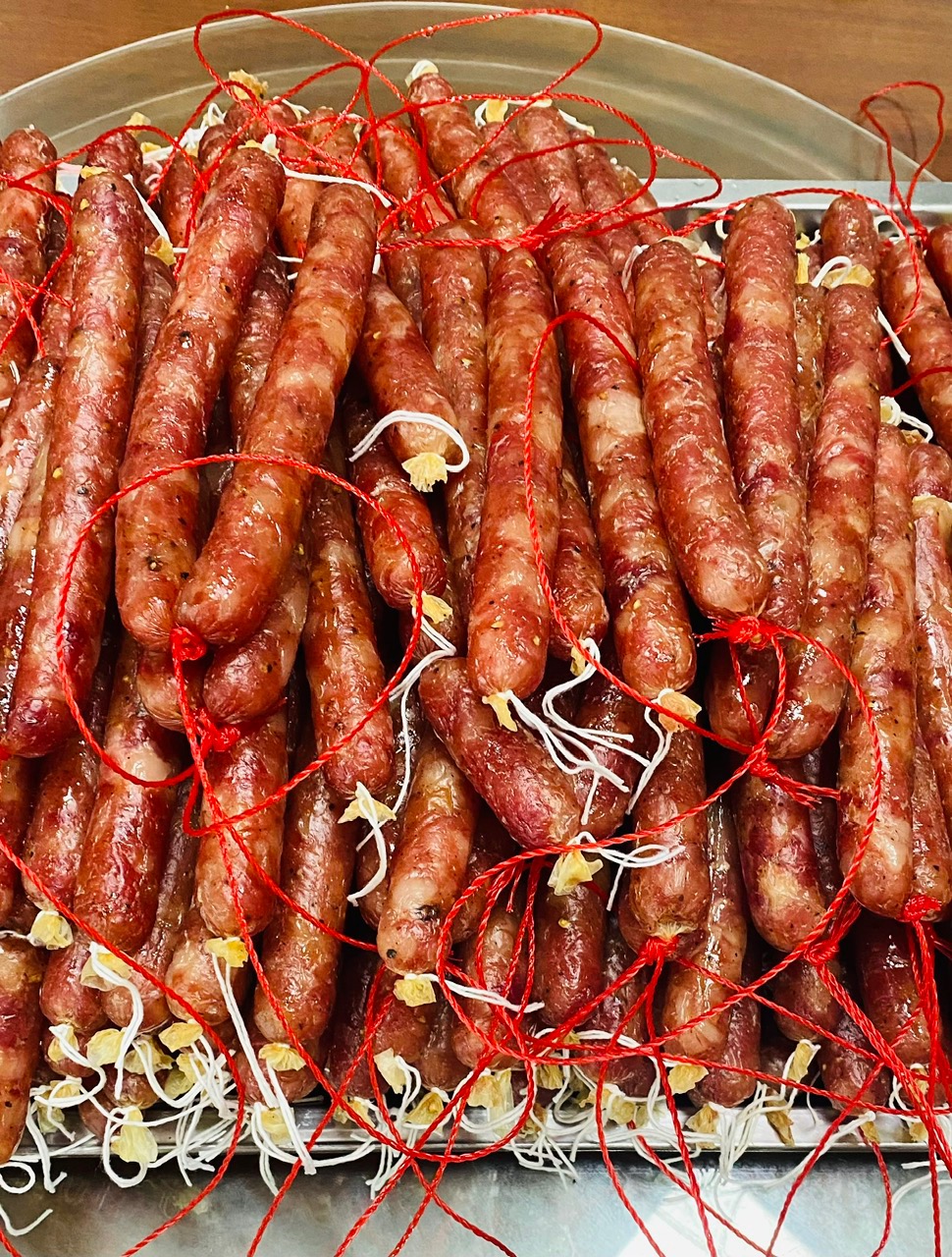 - Gia vị trộn sẵn làm Lạp Xưởng: 150gr- 200gr. -Thịt nạc heo ( cắt hạt lựu ) 800gr -Mỡ heo (luộc rồi cắt hạt lựu )200gr Tiêu ( tuỳ thích) Cách Làm: -Cho gia vị trộn sẵn vào thịt nạc và mỡ heo trộn đều, nhồi kỷ đến dẻo, mịn. Tiếp tục nhồi, rồi dồn hỗn hợp vào vỏ Lạp xưởng thật chặt tay ( có thể làm bằng máy ). -Phơi nắng hoặc Sấy Lạp Xưởng ở nhiệt độ 55-60*c ,cho đến khi Lạp Xưởng khô theo sở thích. -Lạp Xửơng thành phẩm bảo quản tủ mát hoặc tủ đông để dùng dần. Gia Vị làm được cho Lạp Xưởng Chay . Bảo quản nơi khô ráo thoáng mát. Sản phẩm hoàn toàn không sử dụng phẩm màu và chất bảo quản .