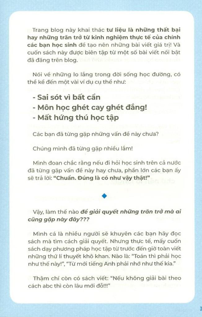 - Mình đã giảm được số lỗi bất cẩn một cách đáng ngạc nhiên. Điểm kiểm tra cũng tăng. - (Nữ, lớp 7) Cuốn sách “Giải quyết những trở ngại trong học tập” được viết bởi tác giả là những sinh viên đang theo học đại học, bật mí cho các bạn học sinh trung học cơ sở và trung học phổ thông cách giải quyết 40 vấn đề thường gặp trong học tập và cuộc sống thường ngày, từ chuyện thi cử, phương pháp học, cho đến chuyện “yêu thầm nhớ trộm” hay định hướng tương lai. Chắc chắn các bạn trẻ sẽ tìm được nhiều điều lí thú và bổ ích. Cuốn sách đã bán 60.000 bản ở Nhật Bản. SAU KHI ĐỌC XONG CUỐN SÁCH, CÁC BẠN SẼ THAY ĐỔI THẾ NÀO???
