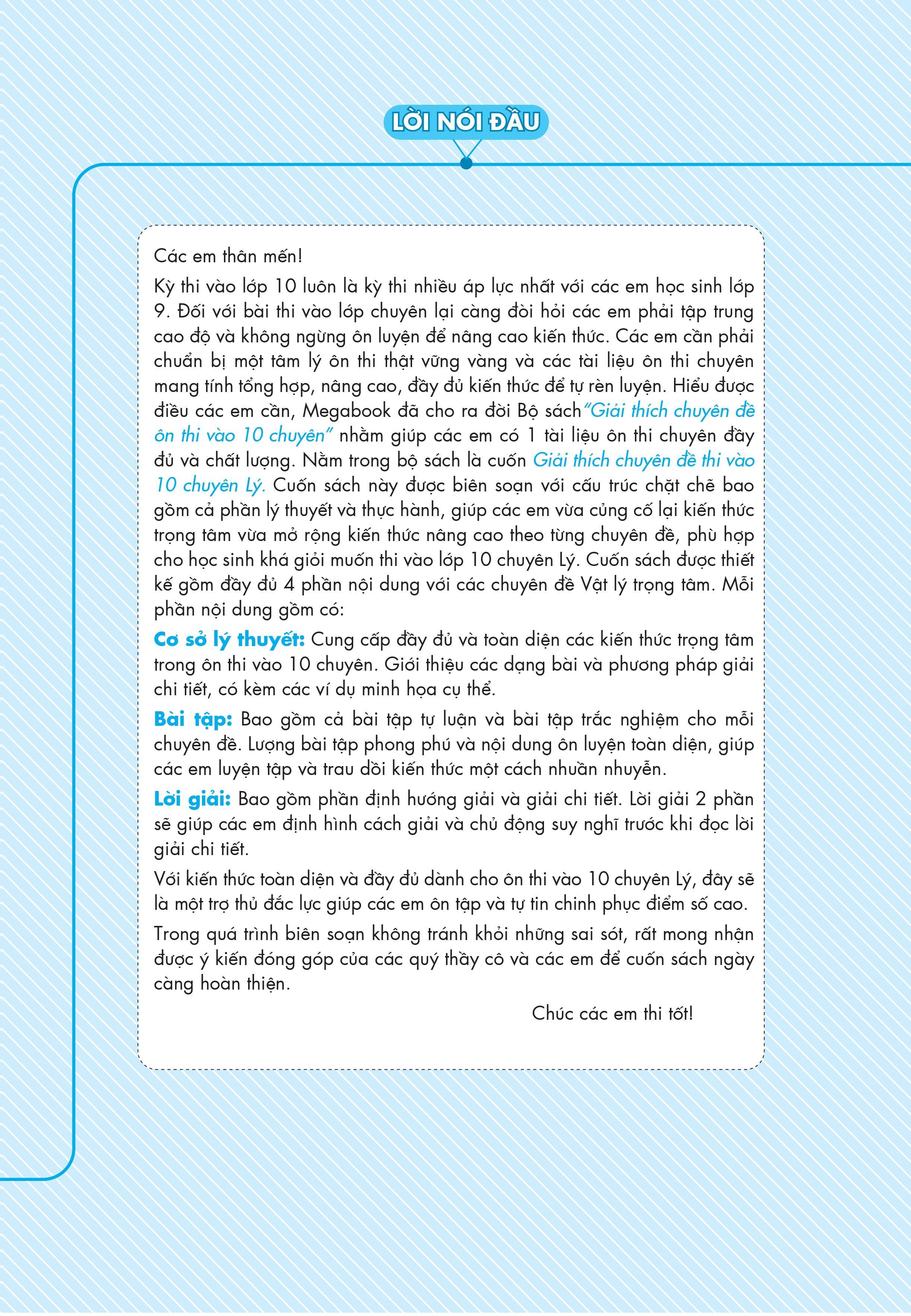 Kỳ thi vào lớp 10 luôn là kỳ thi nhiều áp lực nhất với các em học sinh lớp 9. Đối với bài thi vào lớp chuyên lại càng đòi hỏi các em phải tập trung cao độ và không ngừng ôn luyện để nâng cao kiến thức. Các em cần phải chuẩn bị một tâm lý ôn thi thật vững vàng và các tài liệu ôn thi chuyên mang tính tổng hợp, nâng cao, đầy đủ kiến thức để tự rèn luyện. Hiểu được điều các em cần, Megabook đã cho ra đời Bộ sách “Giải thích chuyên đề ôn thi vào 10 chuyên” nhằm giúp các em có 1 tài liệu ôn thi chuyên đầy đủ và chất lượng. Nằm trong bộ sách là cuốn Giải thích chuyên đề thi vào 10 chuyên Lý.