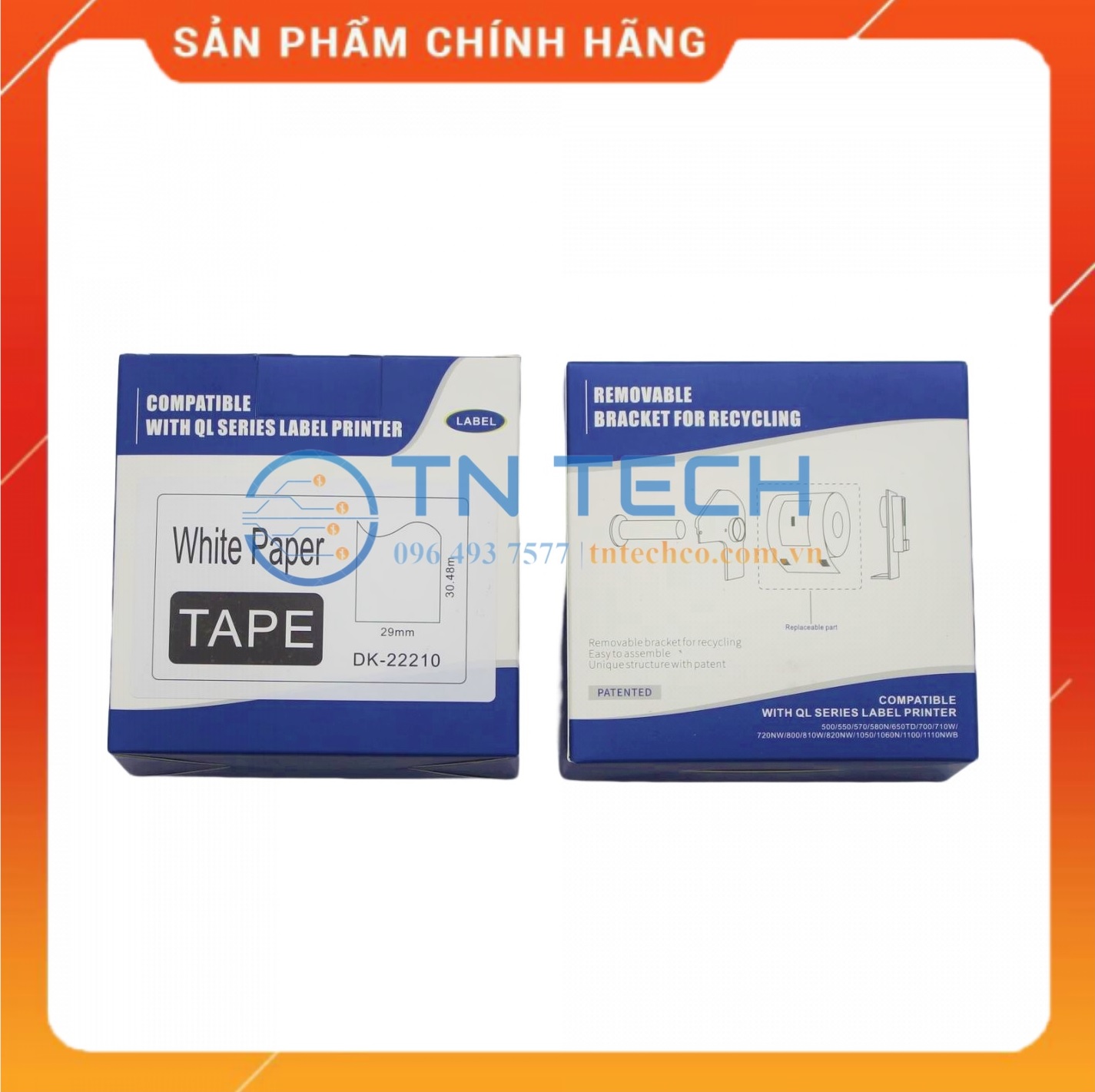 - Mã hàng: DK-22210 - Màu sắc: Chữ đen, nền trắng - Loại nhãn: nhãn giấy - Kích thước: 29mm x 30.48m - Tương thích: với các loại máy in Brother QL Nhãn in Brother DK-22210