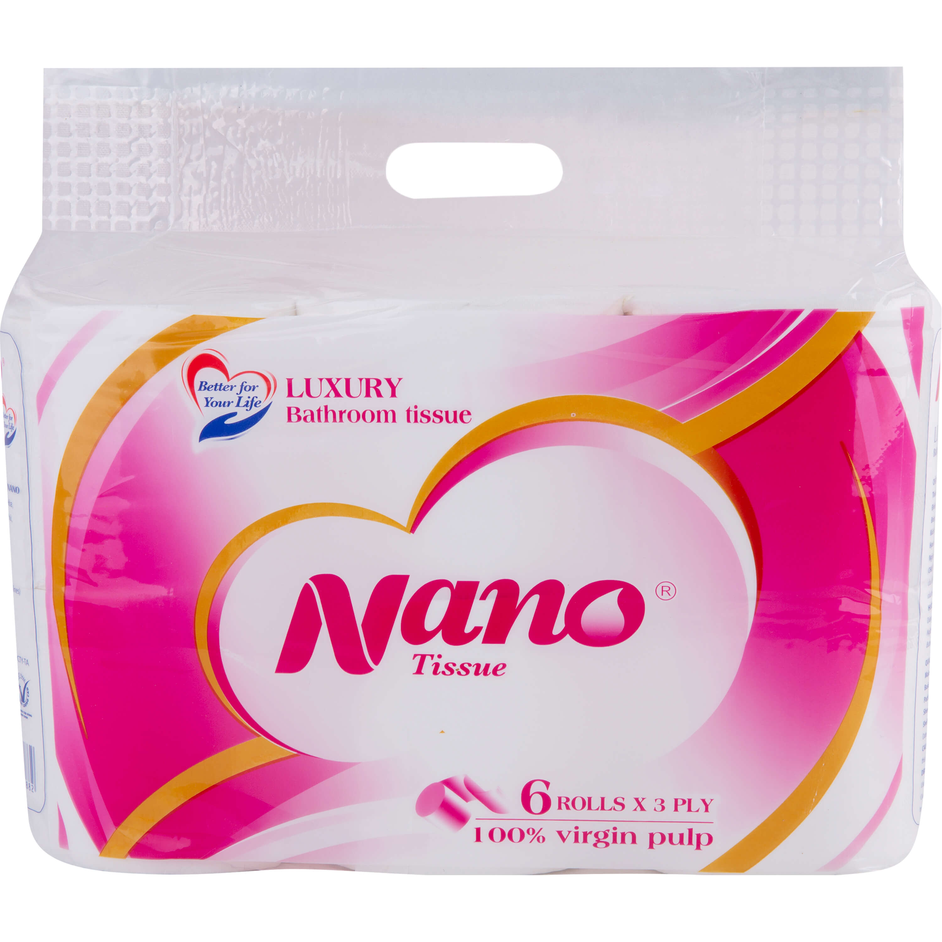 Giấy vệ sinh thương hiệu Nano với thành phần từ 100% bột giấy nguyên chất, an toàn cho da. Giấy vệ sinh Nano lốc 6 cuộn 3 lớp, mềm mại, thấm hút tốt, dùng để vệ sinh cá nhân, lau chùi các bề mặt, vật dụng, gia đình, văn phòng.