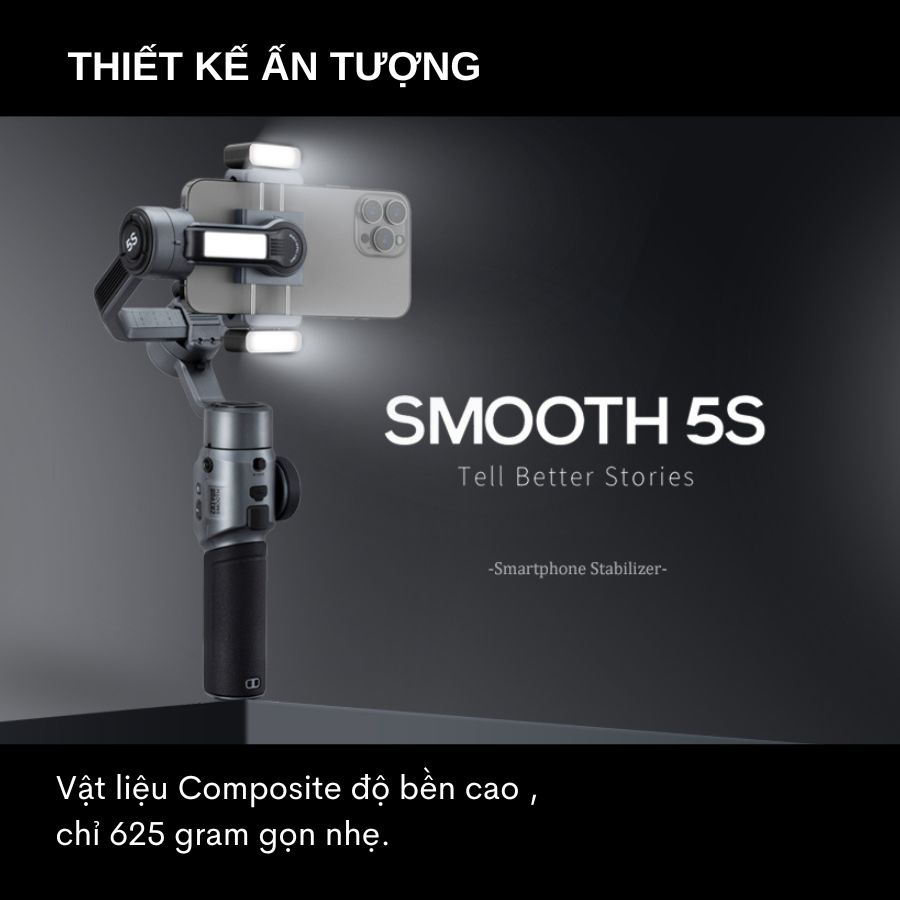 - Thiết kế nhỏ gọn và thời trang Gimbal Zhiyun Smooth 5S sở hữu thiết kế thông minh và gọn nhẹ giúp người dùng dễ dàng mang theo trong quá trình di chuyển và bảo quản nhanh chóng. Được làm bằng vật liệu Composite cung cấp độ bền cao cho nên bạn có thể cầm trên tay cả ngày dài mà không cảm thấy mỏi cổ tay. Mặc dù sở hữu cân nặng chỉ 625 gram nhưng thiết bị vẫn cho phép kết nối với các dòng điện thoại dày và rộng hơn. Hỗ trợ nhiều thiết bị trong đó có cả những chiếc điện thoại gắn ống kính bên ngoài. Mẫu gimbal thế hệ mới