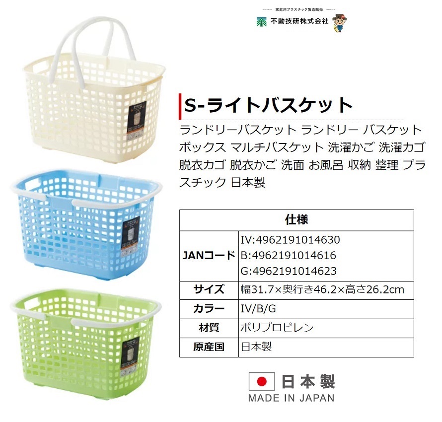 Giỏ xách đựng đồ giặt cỡ lớn S-Light Fudo Giken (Made in Japan) Xuất xứ: Nhật Bản/ Made in Japan Thông tin chi tiết: Chất liệu: Nhựa PP (Polypropylene) cao cấp với bề mặt trơn nhẵn, an