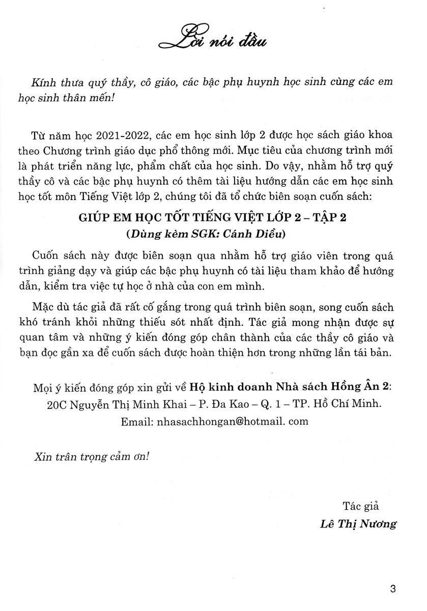 Từ năm học 2021-2022, các em học sinh lớp 2 được học sách giáo khoa theo Chương trình giáo dục phổ thông mới. Mục tiêu của chương trình mới là phát triển năng lực, phẩm chất của học sinh. Do vậy, nhằm hỗ trợ quý thầy cô và các bậc phụ huynh có thêm tài liệu hướng dẫn các em học sinh học tốt môn Tiếng Việt lớp 2, chúng tôi đã tổ chức biên soạn cuốn sách: GIÚP EM HỌC TỐT TIẾNG VIỆT LỚP 2 – TẬP 2 (Dùng Kèm SGK Cánh Diều)