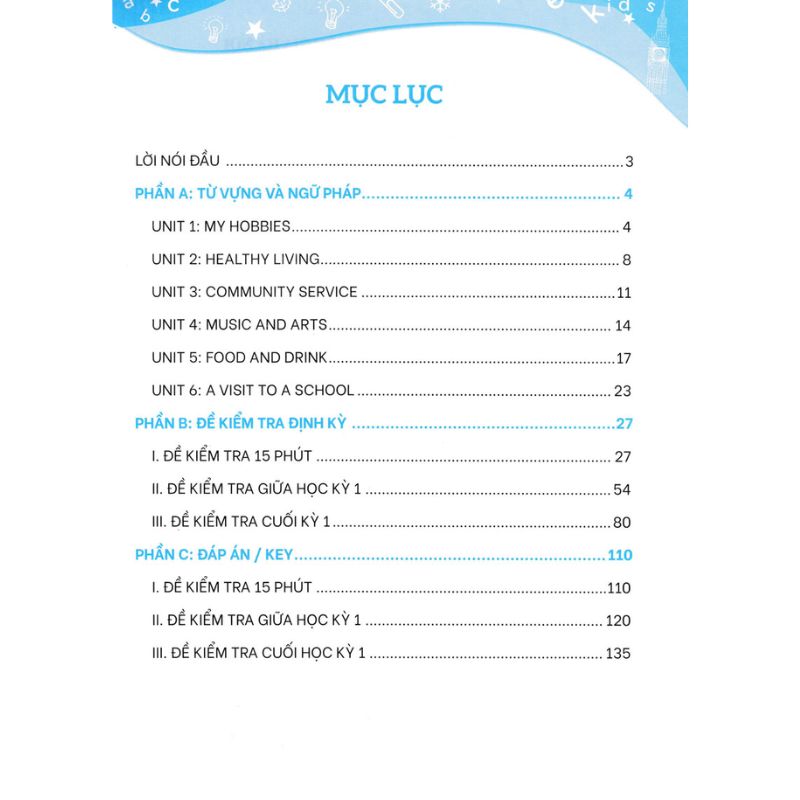 “Bộ đề kiểm tra định kỳ 4 kỹ năng nghe - nói - đọc - viết Tiếng Anh lớp 7” nhằm rèn luyện cho các em kĩ năng làm bài thi, làm chủ các dạng đề, hiểu được kết cấu và cách thức ra đề của từng kỳ thi. Khi các em đã quen với các dạng bài tập và trải nghiệm làm đề thường xuyên thì việc tự tin trước các kỳ thi là điều hiển nhiên có được.