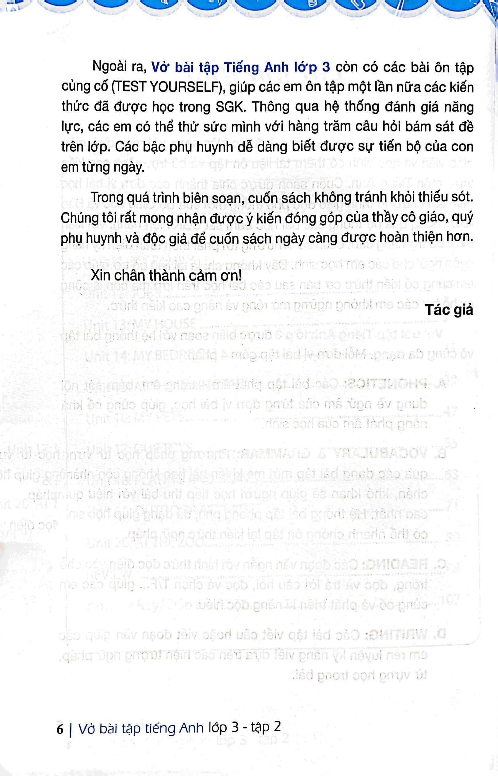 Vở bài tập Tiếng Anh lớp 3 được biên soạn với mục đích giúp giáo viên và học sinh có thêm tài liệu ôn tập và bổ trợ, nâng cao kiến thức môn Tiếng Anh. Cuốn sách được chia thành các đơn vị bài học bám sát chương trình giáo dục phổ thông mới của Bộ Giáo dục và Đào tạo. Thông qua hệ thống các bài học bám sát SGK hiện hành, với kiến thức bổ trợ nâng cao, cuốn sách hướng tới phát triển toàn diện kỹ năng ngôn ngữ cho các em học sinh. Đây không chỉ là tài liệu bổ trợ giúp các em củng cố kiến thức cơ bản sau các bài học trên lớp, mà còn là công cụ hỗ trợ các em không ngừng mở rộng và nâng cao kiến thức.