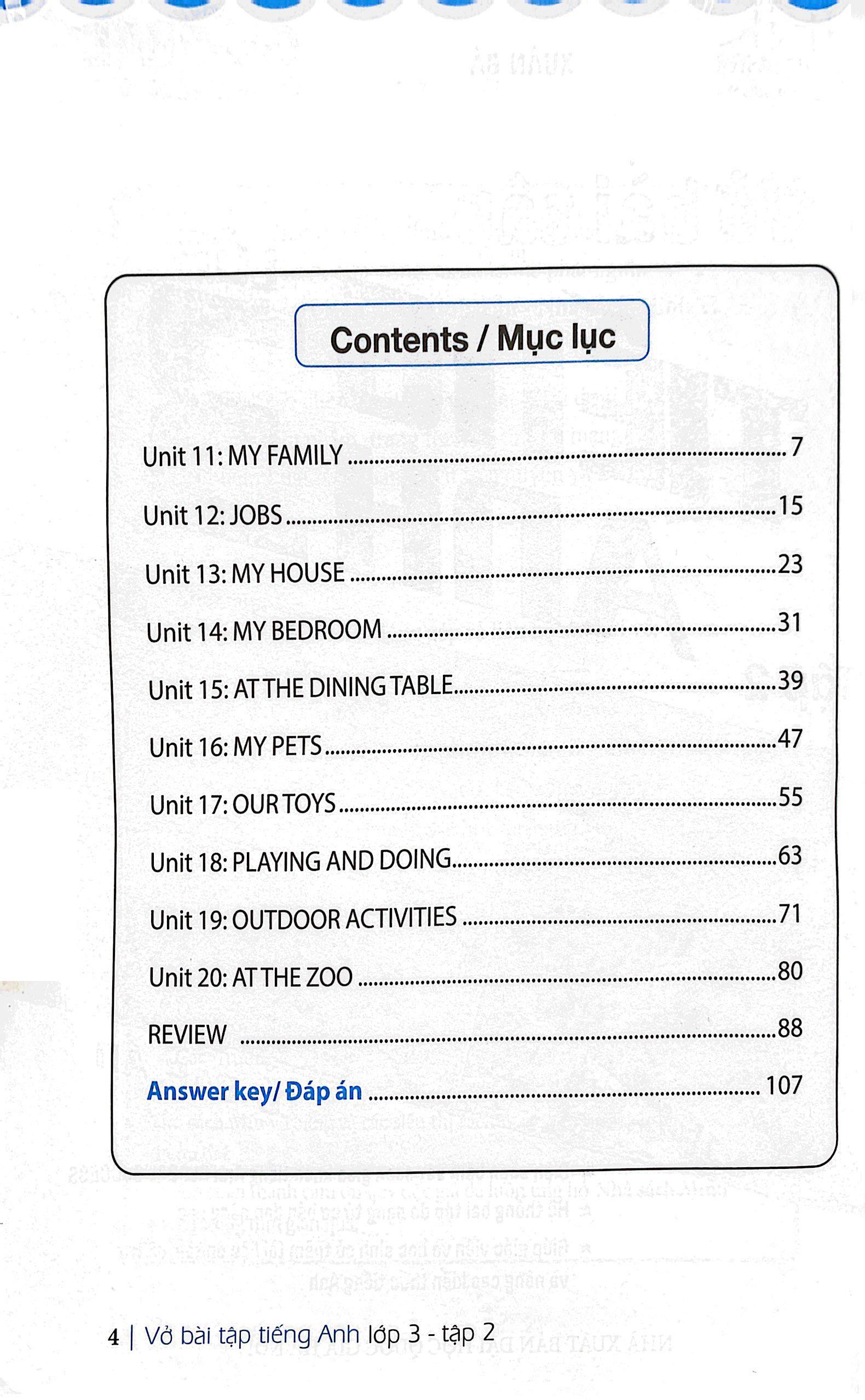 Vở bài tập Tiếng Anh lớp 3 được biên soạn với hệ thống bài tập vô cùng đa dạng. Mỗi đơn vị bài tập gồm 4 phần: