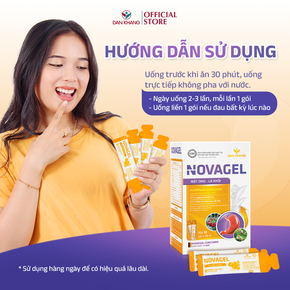 - Nên sử dụng Novagel khi có triệu chứng dư acid: trào ngược, ợ nóng, khó tiêu. Sử dụng khi đau trong vòng 1-2 tuần. Nếu hết triệu chứng đau nên sử dụng thêm viên uống Novacurmin từ 1-2 viên/ ngày để làm lành vết loét.