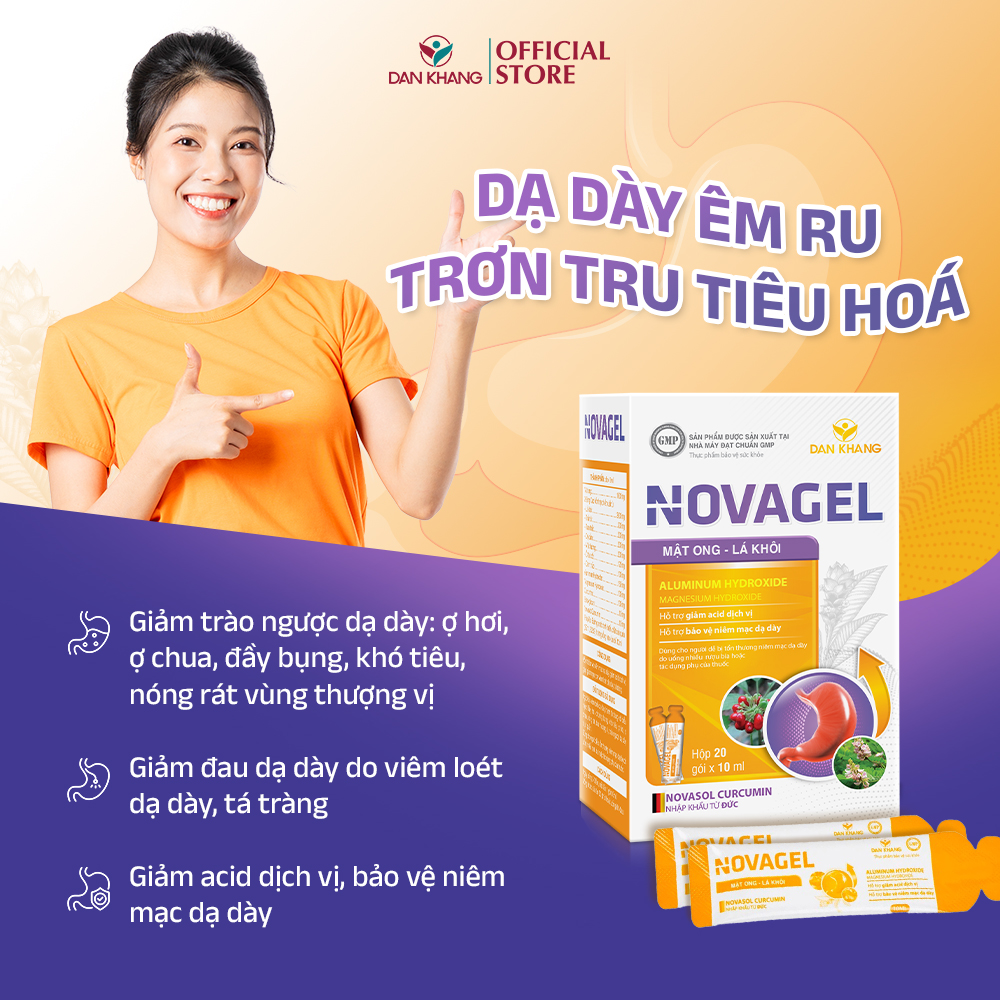 GÓI UỐNG GIẢM ĐAU DẠ DÀY NOVAGEL HỘP 20 GÓI Thành phần gói uống hỗ trợ giảm đau dạ dày tức thì Novagel Thành phần cho 10ml: Mật ong……………………………………… 1000mg 200mg Cao hỗn hợp chiết xuất từ: +Lá Khôi…………………………………… 2000mg +Trần bì……………………………………… 300mg +Tam thất………………………………… 200mg +Dạ cẩm…………………………………… 200mg +Mộc hương………………………………. 200mg +Ô tặc cốt…………………………………….120mg +Cam thảo………………………………… 100mg AluminumHydroxide…………………….150mg MagnesiumHydroxide………………….150mg Curcumin………………………………………100mg Beta– glucan………………………………….10mg NovasolCurcumin………………………… Phụ liệu: Đường, nước tinh khiết, chất bảo quản (E211, E202), hương tổng hợp vừa đủ10ml. NHÓM THẢO DƯỢC QUÝ CỦA Y HỌC CỔ TRUYỀN: