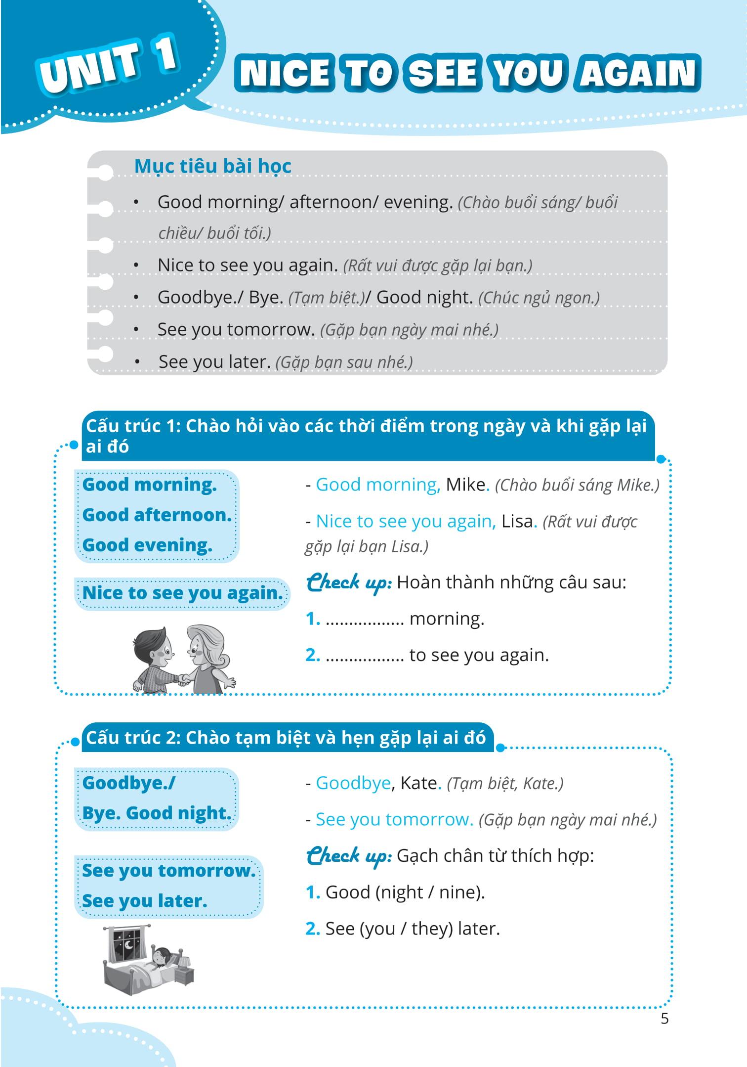 - Cấu trúc sách rất khoa học và logic, giúp các con dễ dàng bắt đầu và tiếp nhận bài học, từ đó học và ghi nhớ kiến thức hiệu quả hơn. Mỗi Unit sẽ được xây dựng với cấu trúc hoàn chỉnh như sau: Mục tiêu bài học → Cấu trúc ngữ pháp → Ví dụ minh họa → Check up (Bài tập ngắn) → Practice (Bài tập thực hành) → Review (Kiểm tra tổng hợp) → Key (Đáp án)