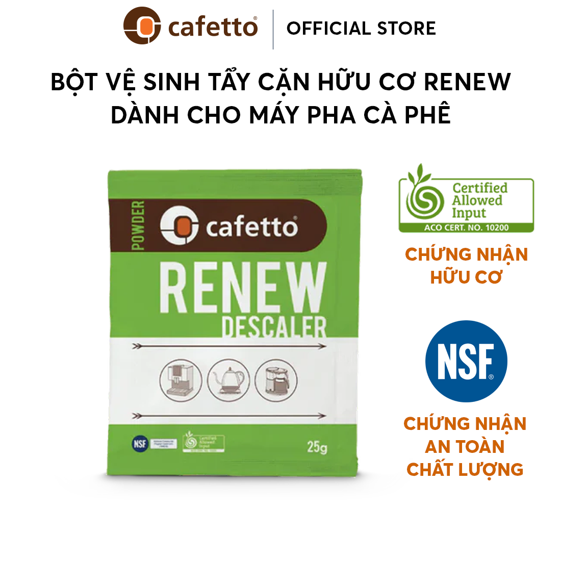 - Rửa sạch và đun sôi lại với nước sạch Sản phẩm phù hợp cho các dòng máy Cho Philips, Fellow Kettles, Brewista, Bonavita, DeLonghi, Jura, Dr Coffee, Gemilai, Saeco. Đây là các nhãn hiệu đã đăng ký của chủ sở hữu tương ứng và không liên quan đến Cafetto. Renew được khuyến nghị để loại bỏ cặn nước cứng khỏi nồi hơi máy pha cà phê espresso, đường ống dẫn cà phê và sữa, máy pha cà phê gia dụng và ấm đun nước. Chứng nhận