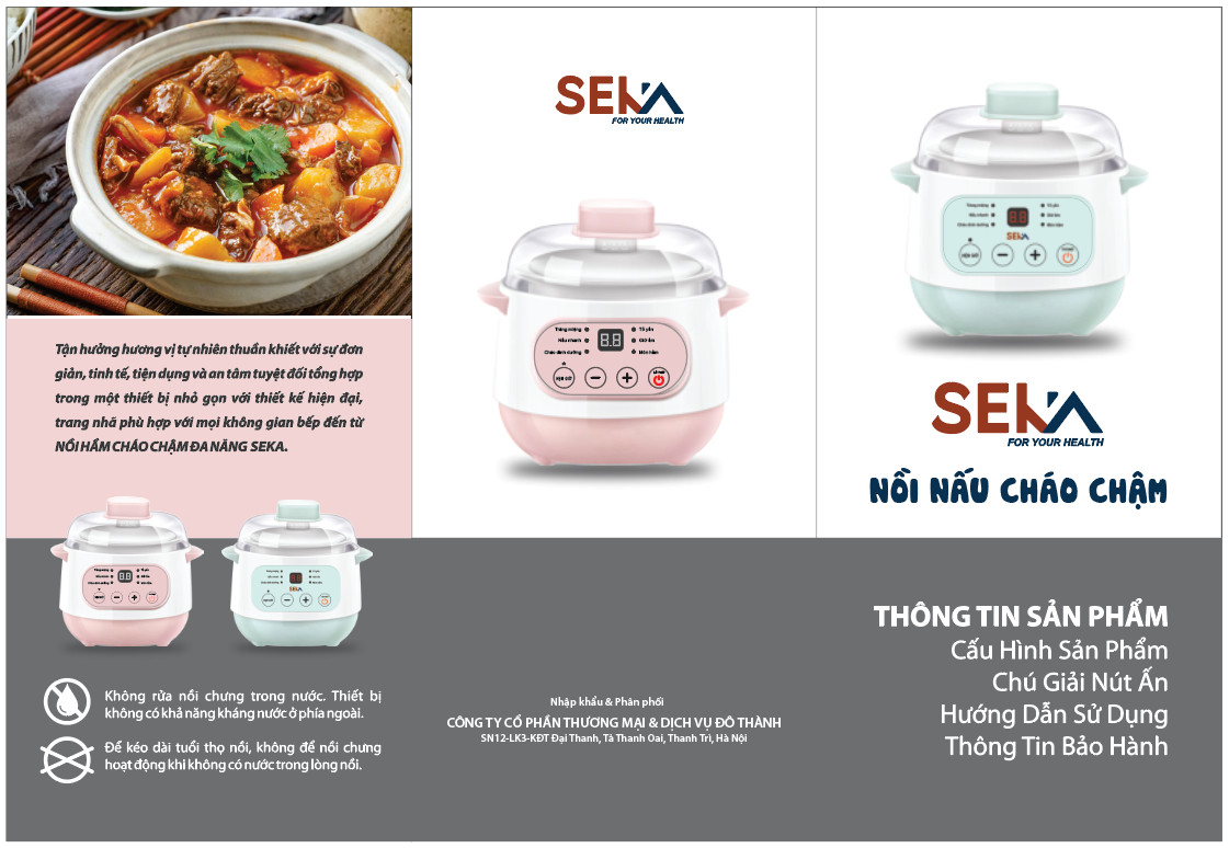 - Giữ nhiệt tốt Ưu Điểm Sản Phẩm Nồi Nấu Cháo Chậm SEKA: Thức ăn chín nhờ thẩm thấu nhiệt độ và sức nóng của hơi nước, nguyên liệu đựng trong lòng gốm, do không tiếp xúc trực tiếp với nước sôi, thức ăn giữ được hương vị ngọt tự nhiên và nhiều chất dinh dưỡng . Nhiệt độ được kiểm soát chặt chẽ để các Vitamin dễ hao tổn như Vitamin B1 trong gạo, Vitamin C trong rau củ được đảm bảo giữ lại trong món ăn, cung cấp lượng dinh dưỡng cao . Khi nấu tuyệt đối không trào, không phải canh bếp, nấu xong tự chuyển sang chế độ Giữ Ấm. Sau khi nấu, không bị tình trạng vữa cháo, chảy nước như khi đựng lâu trong nồi cơm điện. Dễ dàng sử dụng: Mẹ chỉ cần cho đầy đủ nguyên liệu cần thiết vào nồi nhấn nút, đặt giờ và…thoải mái đi làm các công việc khác mà không sợ trào, cháy, khê bởi vì nồi đã có chế độ tự động ngắt và giữ ấm. Thức ăn nấu xong được giữ ấm trong vòng 8 tiếng Thiết kế nhỏ gọn, linh hoạt, thuận tiện cho việc di chuyển và cất gọn gàng. Tiết kiệm chi phí, điện năng: Công suất nồi nấu chậm rất thấp cộng với lòng nồi bằng sứ nên khả năng giữ nhiệt và tiết kiệm điện vô cùng tốt. Chế độ giữ ấm kép : nhấn bằng tay hoặc tự động giữ cho món ăn Lõi sứ: truyền nhiệt và giữ nhiệt tốt, giúp cho đồ ăn mau chín, ko tốn điện, ko thoát hơi làm mất đi các chất từ đồ ăn. Vỏ ngoài bằng chất liệu nhựa cao cấp nên dễ dàng lau chùi, hạn chế nứt vỡ Dung tích 1L đủ 3 bữa cháo cho bé, các mẹ có thể nấu từ tối hôm trước để sáng hôm sau bé dậy có cháo ăn luôn, hết thời gian nấu nồi tự chuyển sang chế độ giữ nhiệt Thông Tin Sản Phẩm Nồi Nấu Cháo SEKA: » Công suất điện 200W » Nguồn điện 220V » Dung tích 1L ( Vừa đủ làm 3 bữa cháo cho bé, chưng yến 2-3 bát ) » Thiết kế nhỏ gọn, trang nhã, phù hợp với không gian nhà bếp. » Giữ nhiệt tốt » Không gây biến tính thực phẩm » Nồi nấu bằng gốm sứ nên dễ vệ sinh và an toàn khi nấu » Có hẹn giờ, tự ngắt nồi khi hết nước