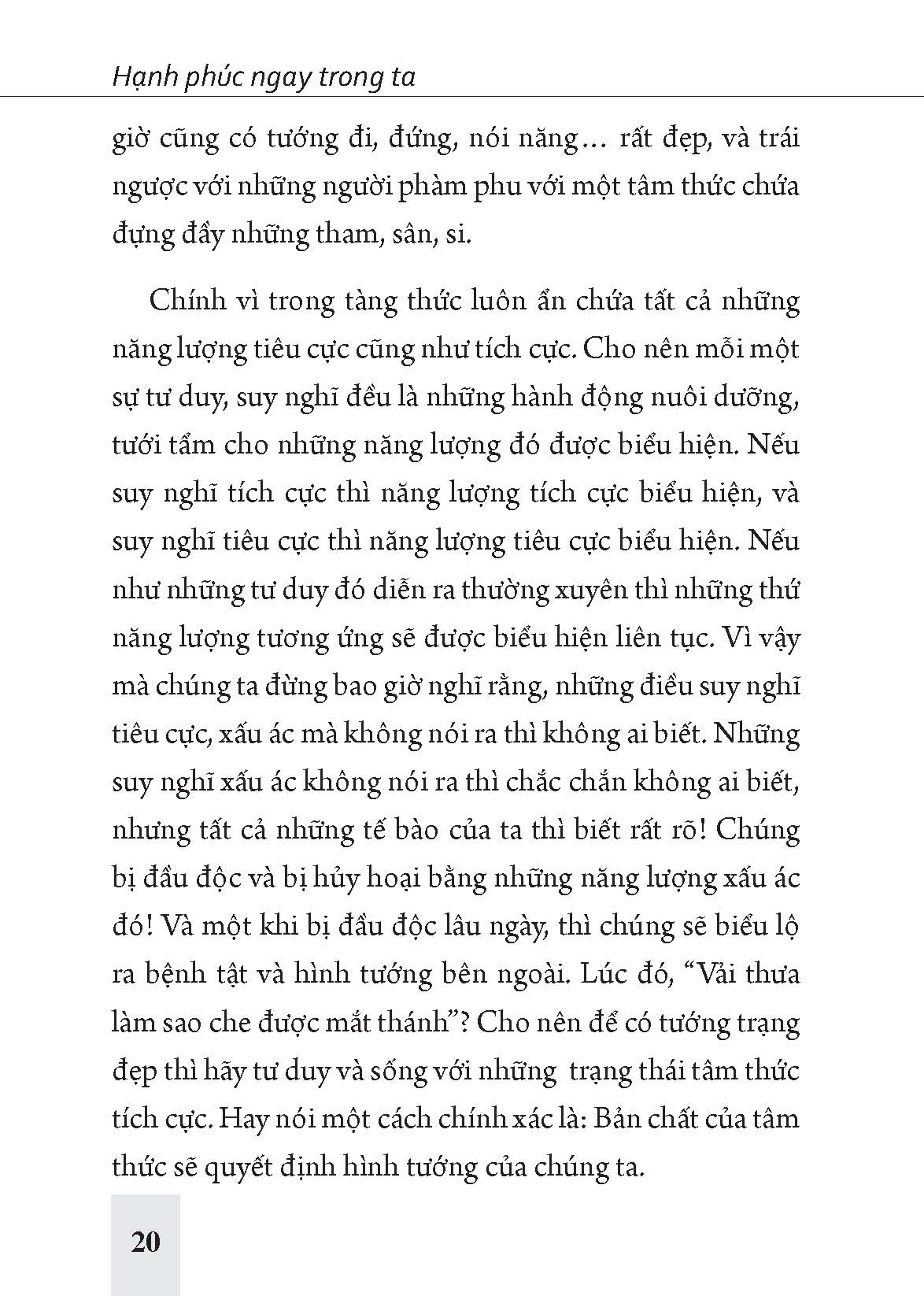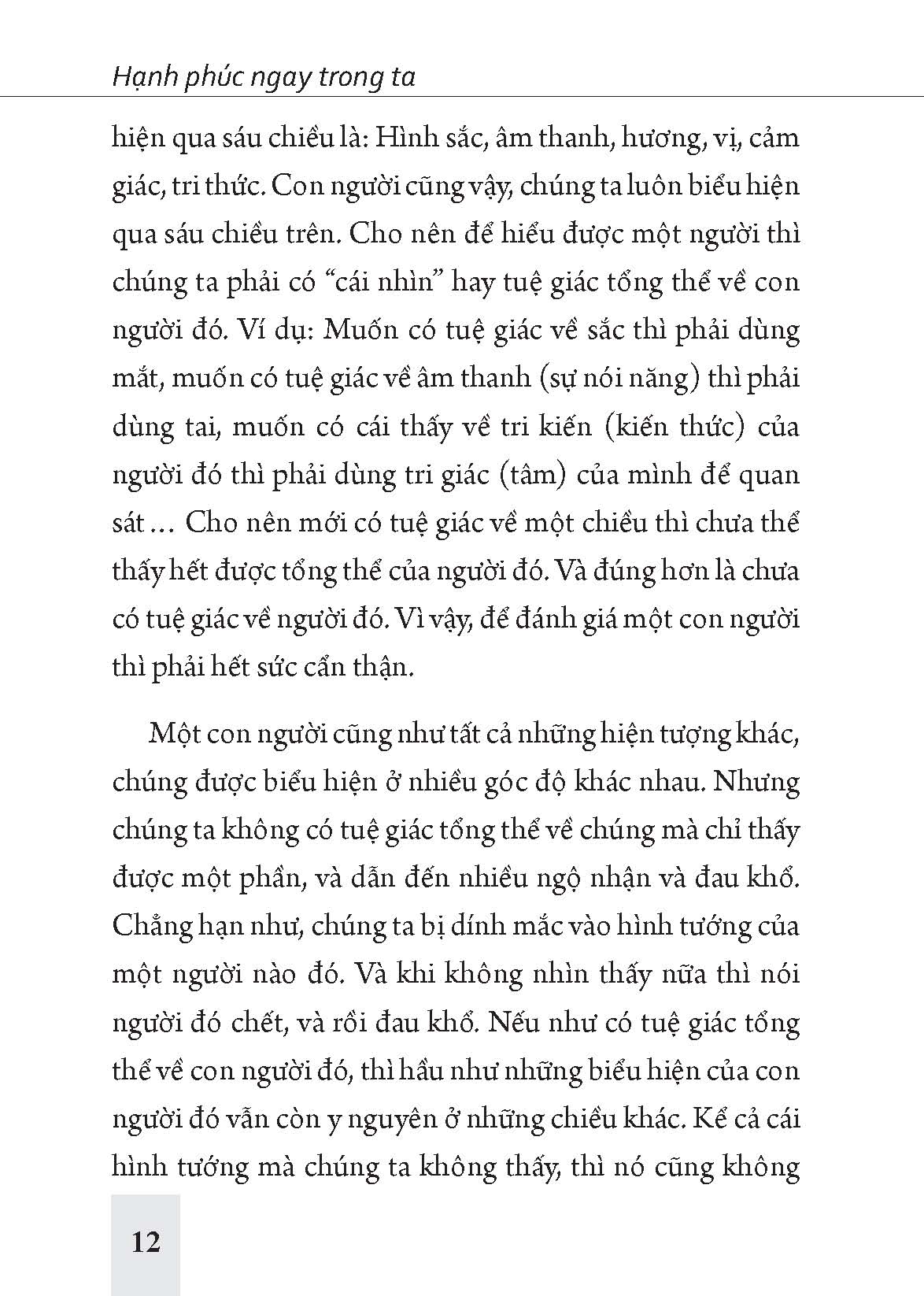 Chúng ta hay có một thói quen nghĩ rằng có một con đường dẫn đến khổ đau hay hạnh phúc. Xem khổ đau hay hạnh phúc như là một cái đích, một điểm cuối của một chặng đường, và đi hết con đường đó thì sẽ tới khổ đau hoặc hạnh phúc. Đó là cách nghĩ rất mơ hồ. Và một sự thật là: “Không có con đường nào dẫn đến khổ đau hay hạnh phúc, mà tự thân khổ đau và hạnh phúc chính là con đường!” Nếu là khổ đau thì con đường đó đầy rẫy những độc tố, phiền não và những cái bẫy “chết người”! Những cái bẫy được tạo nên một cách rất khéo léo và tinh vi, và chỉ cần bước một bước chân lên con đường đó là đã khổ ngay lập tức; bước một bước chân trên đó là đã chịu trận ngay rồi. Và hạnh phúc cũng vậy. Nếu là hạnh phúc thì chỉ cần bước một bước chân trên con đường đó thì cũng hạnh phúc ngay lập tức, chứ không cần phải đi hết con đường.