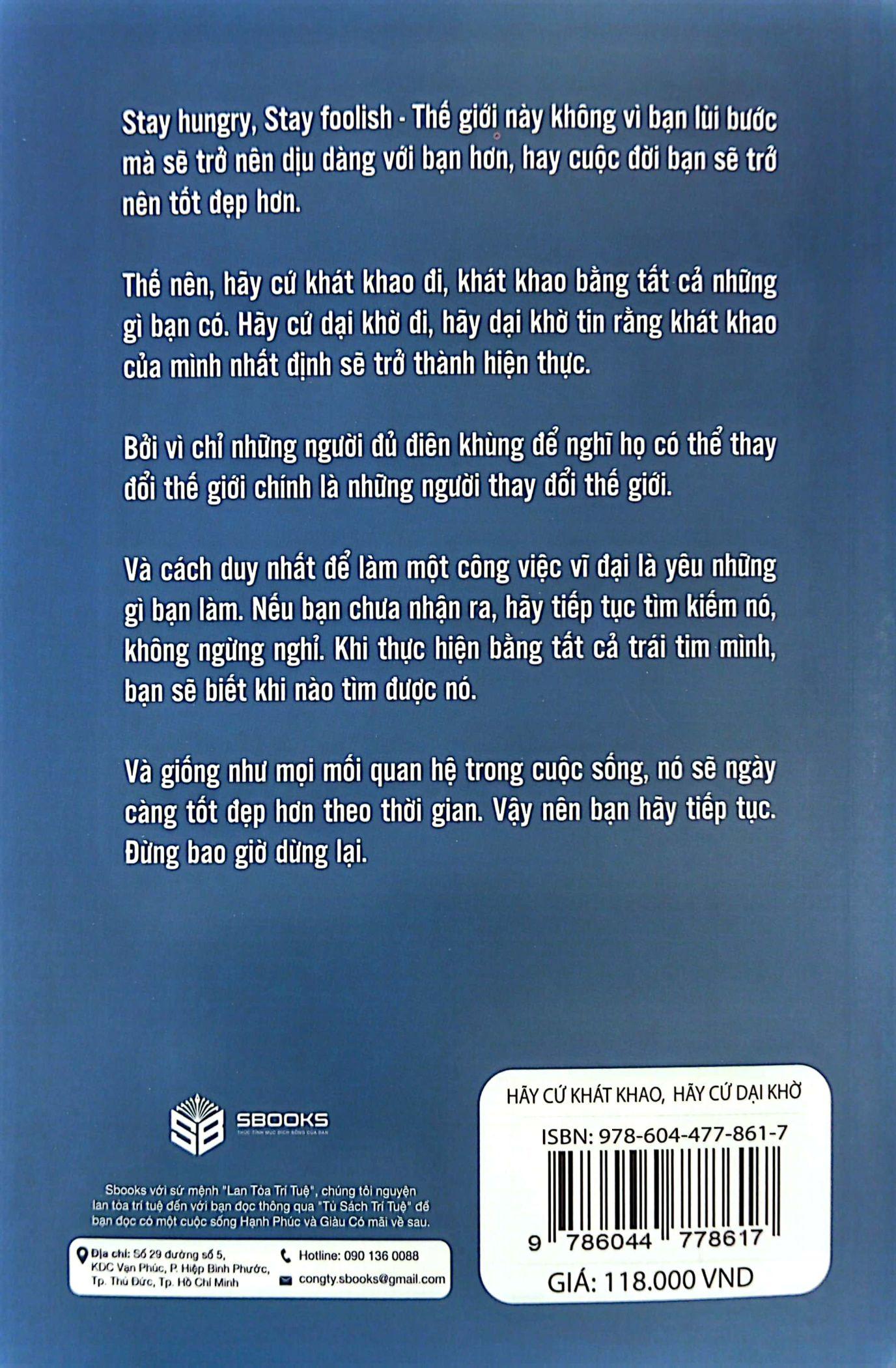 STAY HUNGRY, STAY FOOLISH - THẾ GIỚI NÀY KHÔNG VÌ BẠN LÙI BƯỚC MÀ SẼ TRỞ NÊN DỊU DÀNG VỚI BẠN HƠN, HAY CUỘC ĐỜI BẠN SẼ TRỞ NÊN TỐT ĐẸP HƠN. THẾ NÊN, HÃY CỨ KHÁT KHAO ĐI, KHÁT KHAO BẰNG TẤT CẢ NHỮNG GÌ BẠN CÓ. HÃY CỨ DẠI KHỜ ĐI, HÃY DẠI KHỜ TIN RẰNG KHÁT KHAO CỦA MÌNH NHẤT ĐỊNH SẼ TRỞ THÀNH HIỆN THỰC.