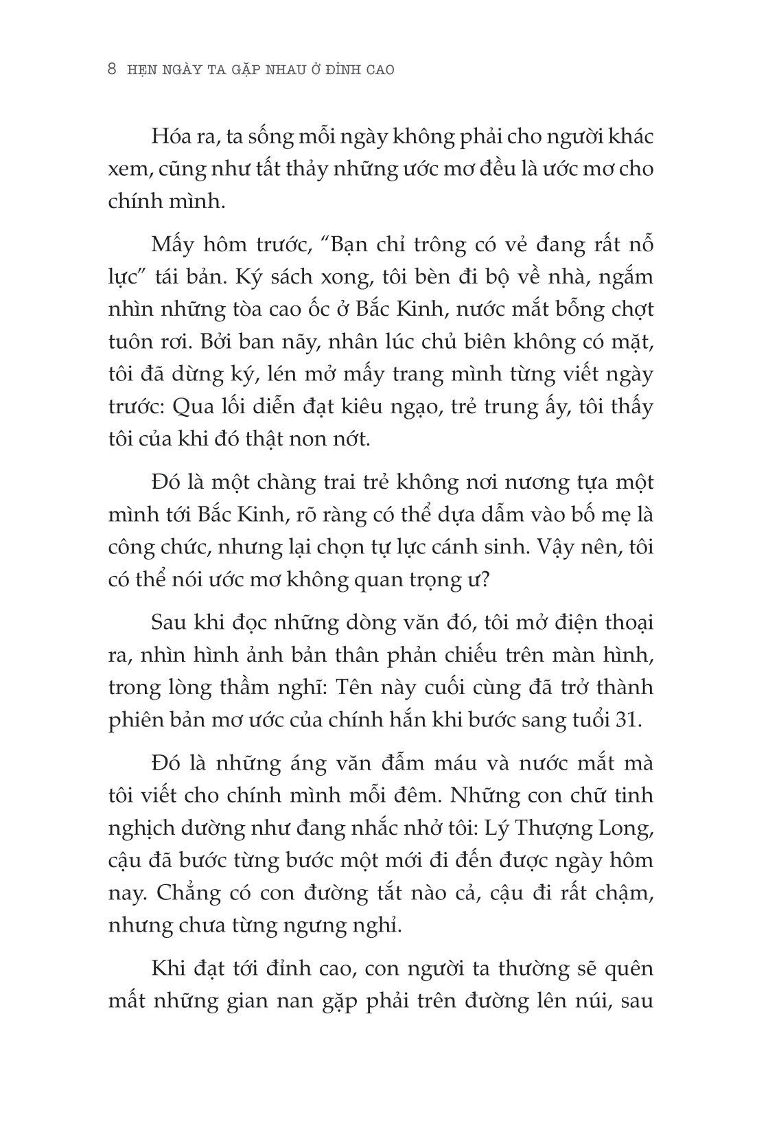 Ở đỉnh cao đó, chúng ta đều có thể gặp được những người ưu tú và đặc biệt là gặp được một phiên bản tốt hơn của chính bản thân. Vì vậy, qua cuốn sách Hẹn ngày ta gặp nhau ở đỉnh cao tác giả Lý Thượng Long muốn nhắn nhủ đến tất cả độc giả một lời khuyên chân thành: “Nếu cuối cùng đều phải nói lời tạm biệt, hãy nói lời tạm biệt với bản thân tồi tệ trong quá khứ của bạn đi!”