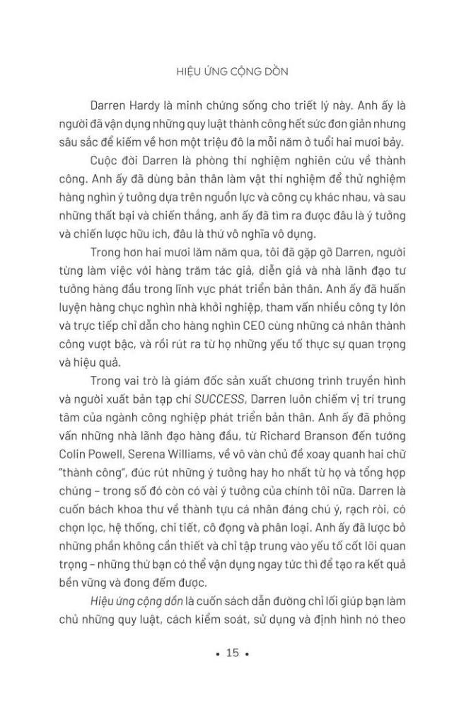 Hiệu Ứng Cộng Dồn Sức Mạnh Của Những Điều Nhỏ Nhặt Lớn Lao Nếu bạn được chọn giữa việc nhận 3 triệu đô la ngay lúc này và một đồng xu sẽ nhân đôi giá trị mỗi ngày trong vòng 31 ngày, bạn sẽ làm gì? Chẳng cần mẹo vặt hay mánh khóe gì, bạn vẫn hoàn toàn có thể thành công nếu như biết cách chú ý và tận dụng những hành động tưởng chừng nhỏ bé hàng ngày, nhờ vào "Hiệu ứng cộng dồn". Cuốn sách nổi tiếng nhất của tác giả Darren Hardy, đã từng lọt top những cuốn sách bán chạy nhất của tạp chí New York Times, sẽ mang đến cho bạn những hướng dẫn cụ thể, chi tiết cùng hàng loạt các ví dụ sinh động, từ đó giúp bạn đạt được những mục tiêu mong muốn bằng cách "cộng dồn" những nhứ nhỏ bé trong cuộc sống hàng ngày.