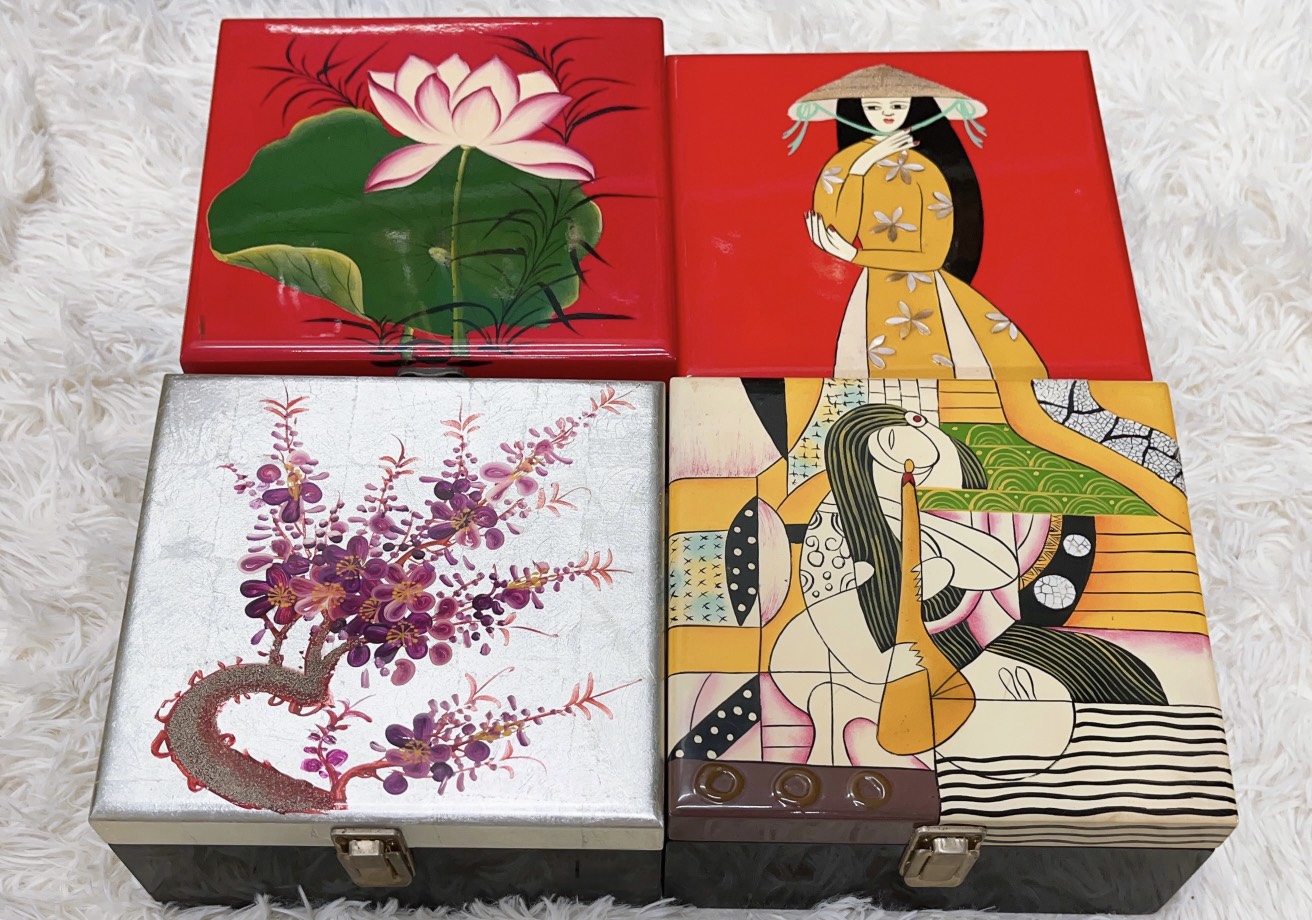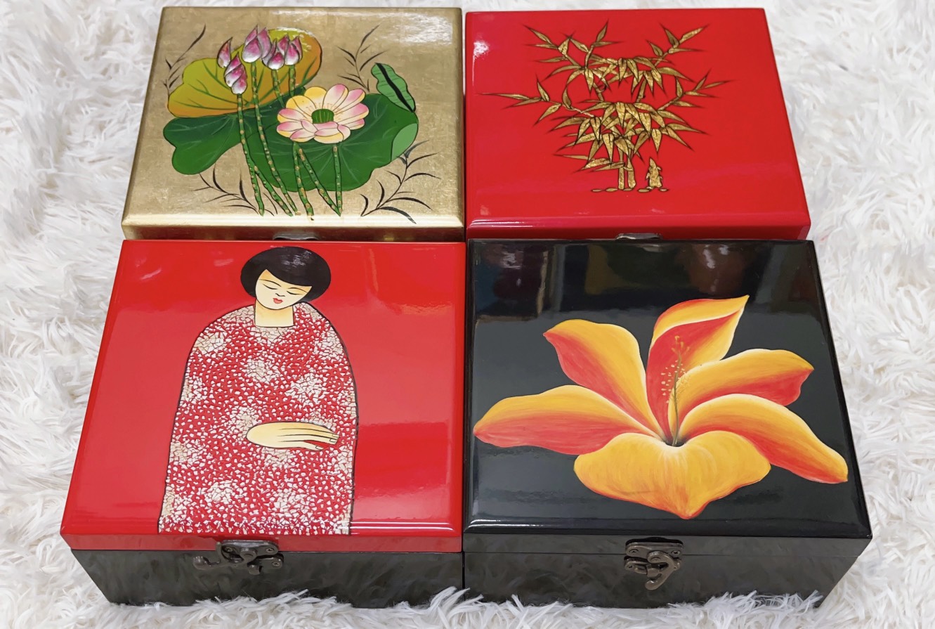 Hộp sơn mài - Hàng thủ công mỹ nghệ Việt Nam được các nghệ nhân tạo hình độc đáo, kết hợp chất liệu gần gũi, quen thuộc và đặc trưng của Việt nam mang đến tính nghệ thuật và thẩm mỹ cao cho tổng thể sản phẩm. Họa tiết được vẽ rồi mài nhiều lần tới khi đạt hiệu quả mà họa sĩ mong muốn. Sau cùng là đánh bóng tranh. Để ra đời một sản phẩm, người thợ phải kiên trì với phương pháp thủ công, thậm chí hàng tháng trời với tất cả sự công phu, cầu kỳ, điêu luyện. ️