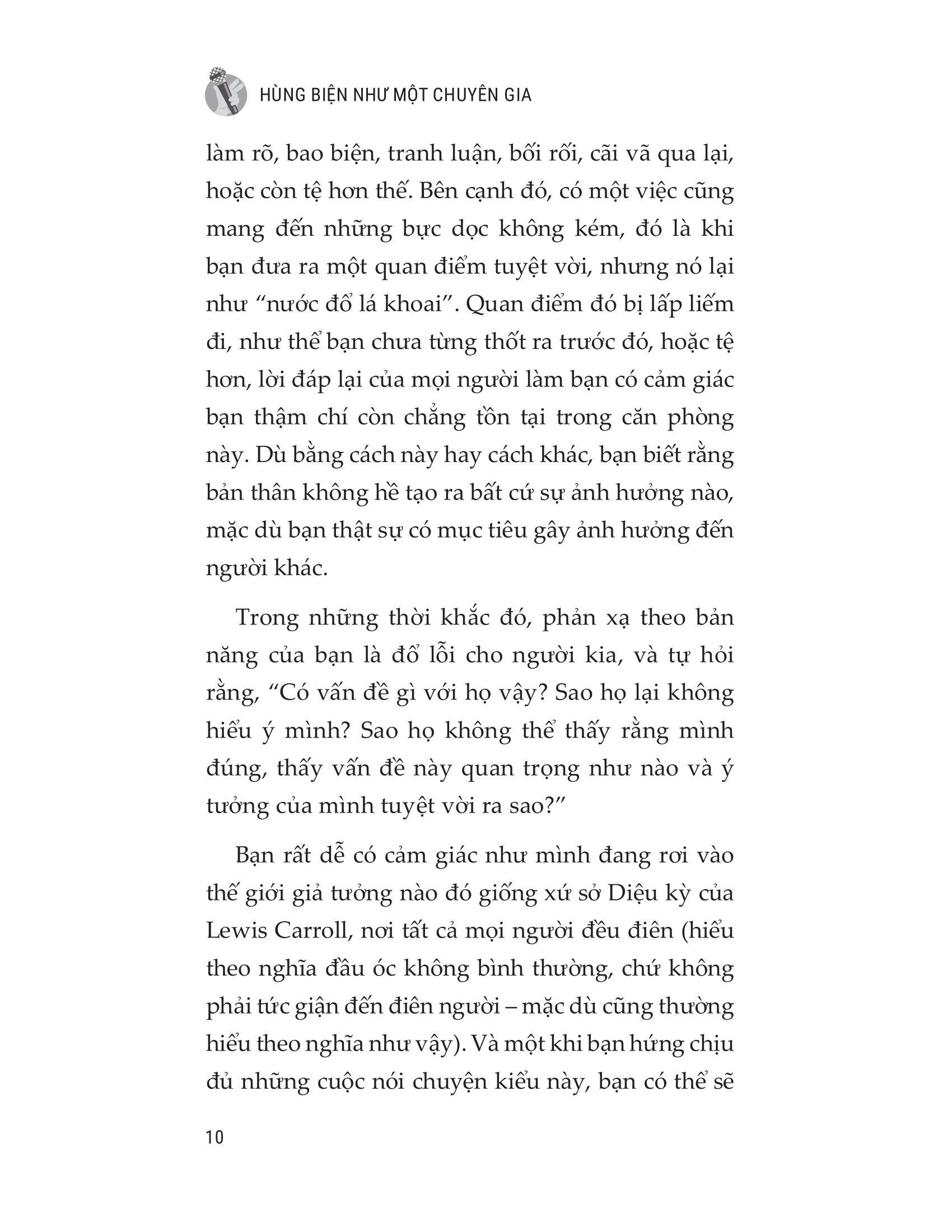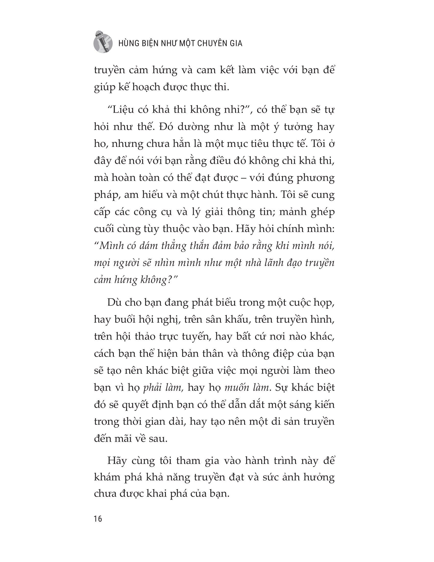 Hùng Biện Như Một Chuyên Gia Kỹ năng thuyết trình là một kỹ năng cần thiết đối với bất cứ ai. Trong cuốn sách này, Tiến sĩ Laura Sicola sẽ hướng dẫn cách để tạo nên một bài thuyết trình lôi cuốn và truyền cảm hứng. Bằng cách rèn luyện các kỹ năng như: xác định điểm mù trong giao tiếp, khám phá phương pháp sử dụng giọng nói nhằm thu hút người nghe, vượt qua rào cản tâm lý và thực hành cách kể chuyện, bạn hoàn toàn có thể trở thành một diễn giả lôi cuốn hoặc một nhà lãnh đạo truyền cảm hứng đối với tất cả mọi người. Cuốn sách trợ giúp chúng ta: