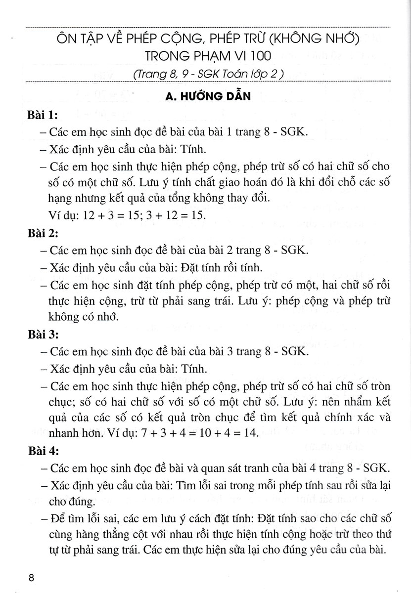 Bên cạnh các bài giảng được biên soạn chi tiết theo nội dung từng bài học, sách còn bao gồm nhiều hướng dẫn mà các em có thể tham khảo và ứng dụng để giải các bài tập toán lớp 2 một cách chuẩn xác. Đồng thời các dạng bài tập nâng cao sẽ giúp các em có thêm sự rèn luyện để nâng cao kỹ năng giải toán và trở thành học sinh giỏi môn Toán.