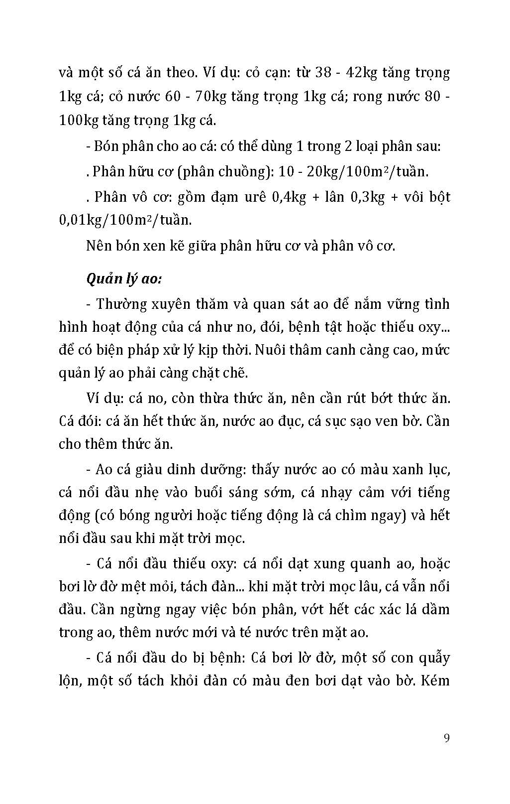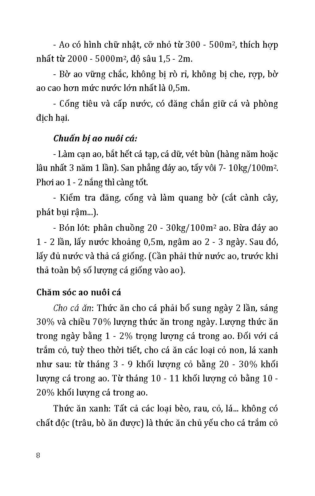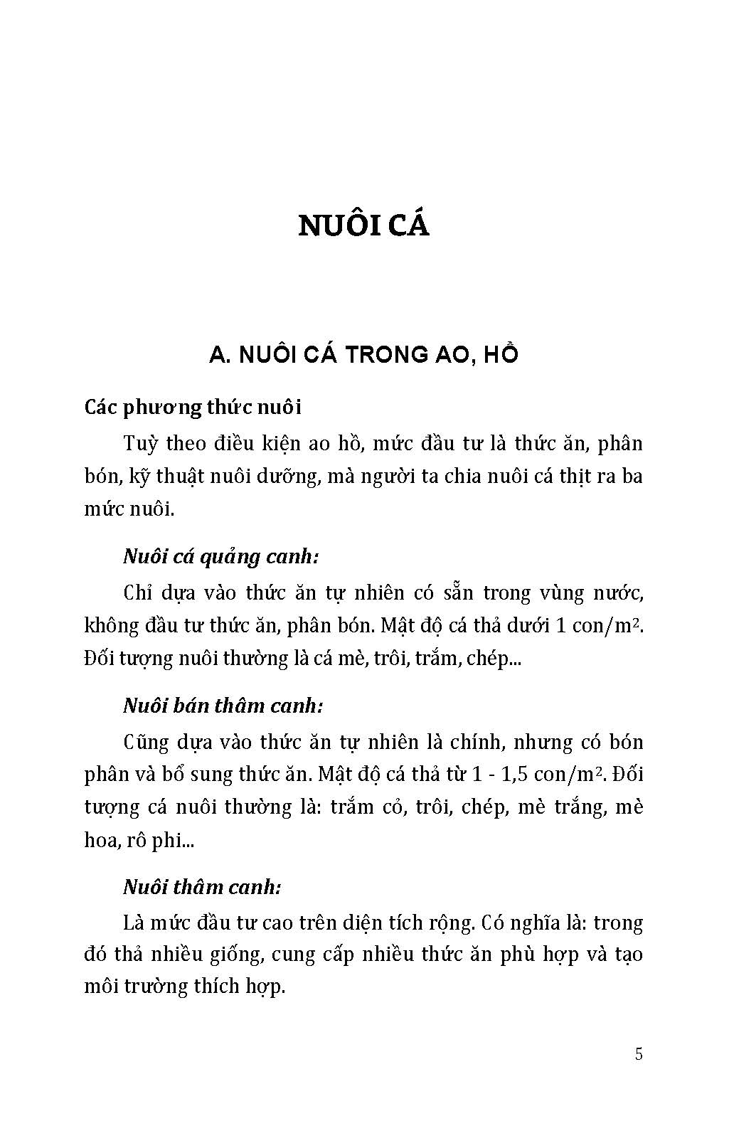 Hướng dẫn kỹ thuật nuôi cá trong các môi trường sống khác nhau như ao, hồ, ao nước tĩnh, ao nước chảy, ruộng lúa, nuôi thả cá giống; kỹ thuật nuôi ếch, lươn như đặc điểm, chuẩn bị giống, cách nuôi, phòng trị bệnh...