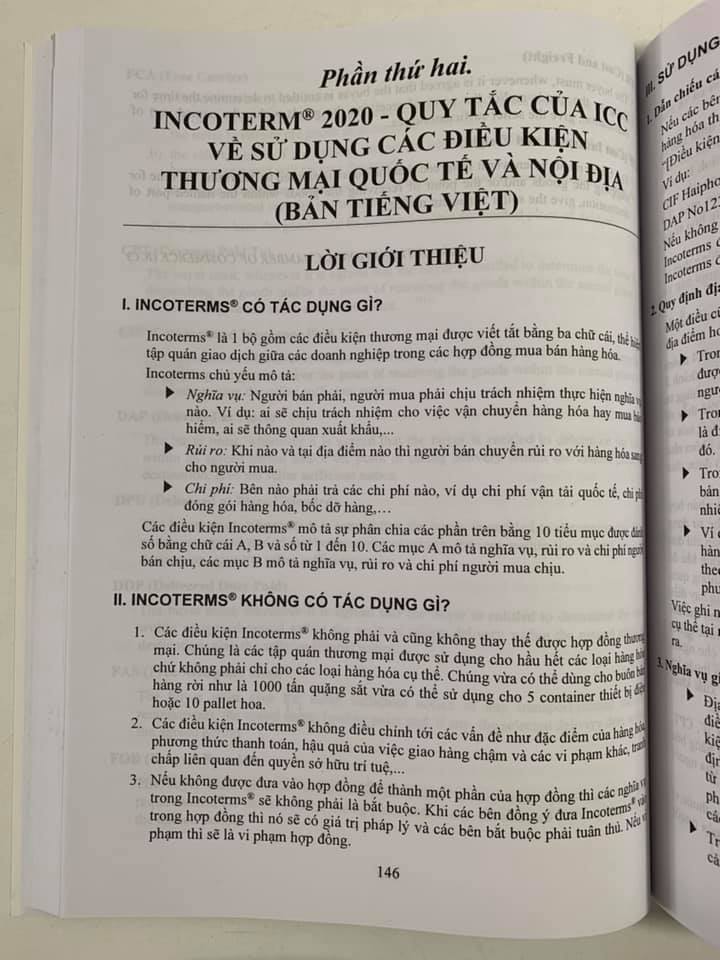 Incoterm 2020 - Quy tắc của ICC về sử dụng các điều kiện thương mại quốc tế và nội địa (Song ngữ Anh - Việt) Nhà xuất bản: Tài Chính Tác giả: Vũ Thu Phương Ngày xuất bản: 3.2020 Khổ sách: 20*28cm Số trang: 486 trang Hình thức bìa: Bìa mềm Công ty phát hành:  Dân Hiền Lời giới thiệu: Incoterms là một bộ các qui tắc thương mại quốc tế được công nhận và sử dụng rộng rãi trên toàn thế giới do Phòng thương mại Quốc tế (ICC) ban hành. Từ khi ra đời (năm 1936) đến nay, Incoterms đã trải qua 7 lần sửa đổi. Như thường lệ, bản incoterms mới ra đời thường sẽ có những thay đổi về mặt hình thức, cấu trúc cũng như thêm mới các diễn giải, hướng dẫn chi tiết nhằm giúp người dùng lựa chọn và sử dụng hiệu quả các điều kiện Incoterms. Bên cạnh những thay đổi này, Ban Soạn thảo Incoterms 2020 của ICC cũng đưa ra các điều chỉnh quan trọng về nội dung của bản Incoterms 2020 so với bản 2010 như sắp xếp lại các mục nghĩa vụ của các bên để làm rõ hơn nội dung của nghĩa vụ giao hàng và phân chia rủi ro, ghi chú dòng chữ on-board trên vận đơn đường biển dùng trong điều kiện FCA… Incoterms 2020 với 11 điều kiện và chính thức có hiệu lực từ ngày 01/01/2020. Nhằm giúp các bạn đọc và doanh nghiệp, doanh nhân nắm rõ các điều kiện Incoterms 2020 để thuận lợi hơn khi đàm phán, kí kết và tổ chức các công việc có liên quan đến hoạt động thương mại quốc tế, Trung tâm Pháp luật Sài Gòn Hà Nội liên kết với Nhà xuất bản Tài Chính cho xuất bản cuốn sách: INCOTERMS 2020 - QUY TẮC CỦA ICC VỀ SỬ DỤNG CÁC ĐIỀU KIỆN THƯƠNG MẠI QUỐC TẾ VÀ NỘI ĐỊA (Song ngữ Anh - Việt) Và Các Văn Bản Mới Nhất Về Kiểm Tra Giám Sát Hải Quan, Xác Định Xuất Xứ Hàng Hóa Xuất Khẩu, Nhập Khẩu Nội dung cuốn sách gồm các phần chính sau: Phần thứ nhất. INCOTERM 2020 - QUY TẮC CỦA ICC VỀ SỬ DỤNG CÁC ĐIỀU KIỆN THƯƠNG MẠI QUỐC TẾ VÀ NỘI ĐỊA (BẢN TIẾNG ANH) Phần thứ hai. INCOTERM 2020 - QUY TẮC CỦA ICC VỀ SỬ DỤNG CÁC ĐIỀU KIỆN THƯƠNG MẠI QUỐC TẾ VÀ NỘI ĐỊA (BẢN TIẾNG VIỆT) Phần thứ ba. NỘI DUNG CHÍNH HIỆP ĐỊNH THƯƠNG MẠI TỰ DO GIỮA CỘNG HÒA XÃ HỘI CHỦ NGHĨA VIỆT NAM VÀ LIÊN MINH CHÂU ÂU Phần thứ tư. QUY ĐỊNH VỀ KIỂM TRA GIÁM SÁT HẢI QUAN, XÁC ĐỊNH XUẤT XỨ HÀNG HÓA XUẤT KHẨU NHẬP KHẨU