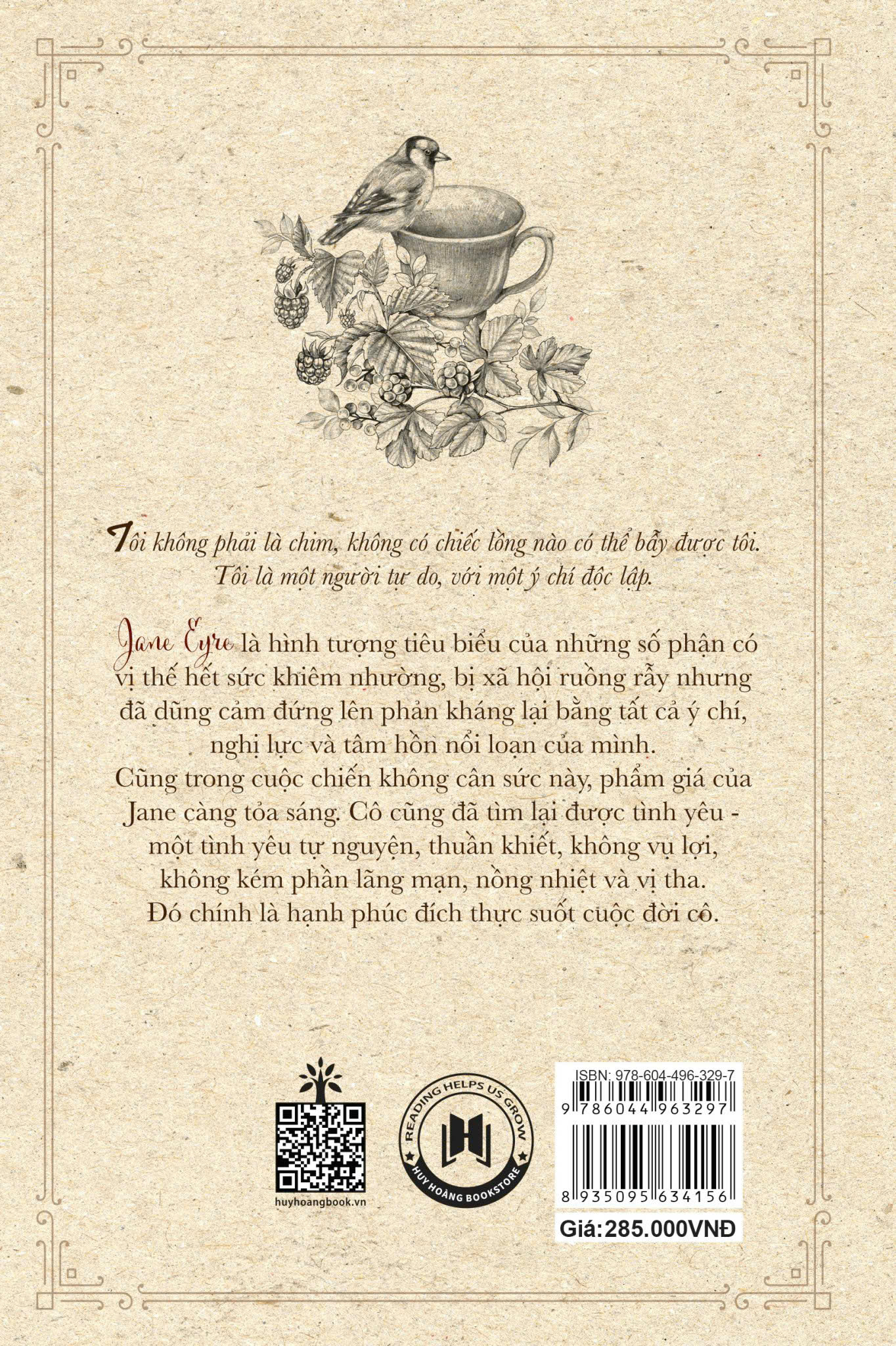 “Tôi không phải là chim, không có chiếc lồng nào có thể bẫy được tôi. Tôi là một người tự do, với một ý chí độc lập” Jane Eyre là hình tượng tiêu biểu của những số phận có vị thế hết sức khiêm nhường, bị xã hội ruồng rẫy nhưng đã dũng cảm đứng lên phản kháng lại bằng tất cả ý chí, nghị lực và tâm hồn “nổi loạn” của mình. Cũng trong cuộc sống không cân sức này, phẩm giá của Jane càng tỏa sáng. Cô cũng đã tìm lại được tình yêu – một tình yêu tự nguyện, thuần khiết, không vụ lợi, không kém phần lãng mạn, nồng nhiệt và vị tha. Đó chính là hạnh phúc đích thực suốt cuộc đời của Jane