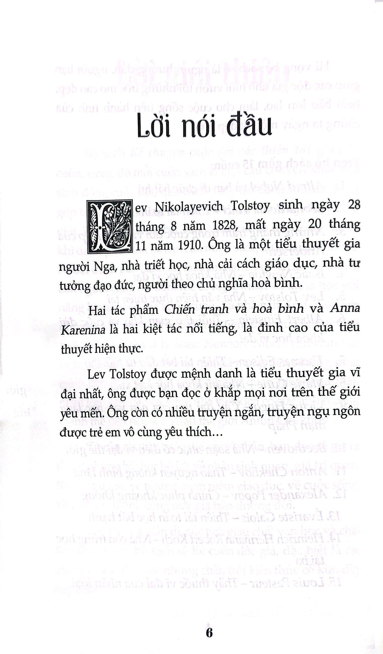 Cuốn sách gồm những câu chuyện viết về cuộc đời và sự nghiệp sáng tác của đại văn hào người Nga Lev Nikolayevich Tolstoy, từ những ngày thơ ấu ở Yasnaya Polyana đến những ngày trải qua biến cố của gia đình ở Moscow. Từ khi tình yêu văn học bắt đầu nảy nở cho đến khi ông tạo dựng cho mình một hành trang quý giá trên con đường cầm bút và viết nên những tác phẩm để đời.