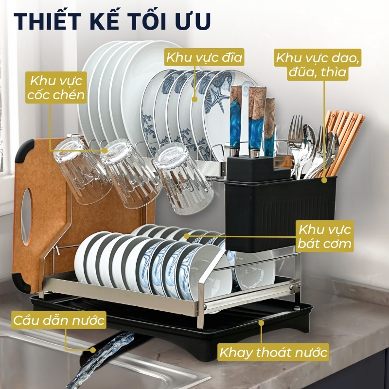 Giá úp bát đĩa 2 tầng, kệ úp chén có ống đũa đa năng kèm khay hứng , sạch sẽ tiện dụng [ Loại 1]