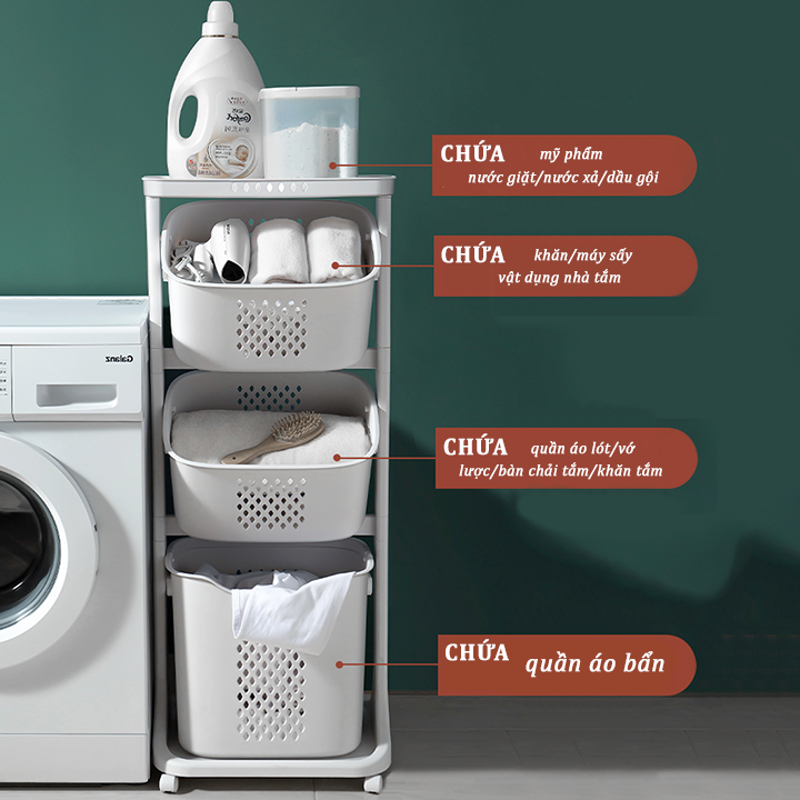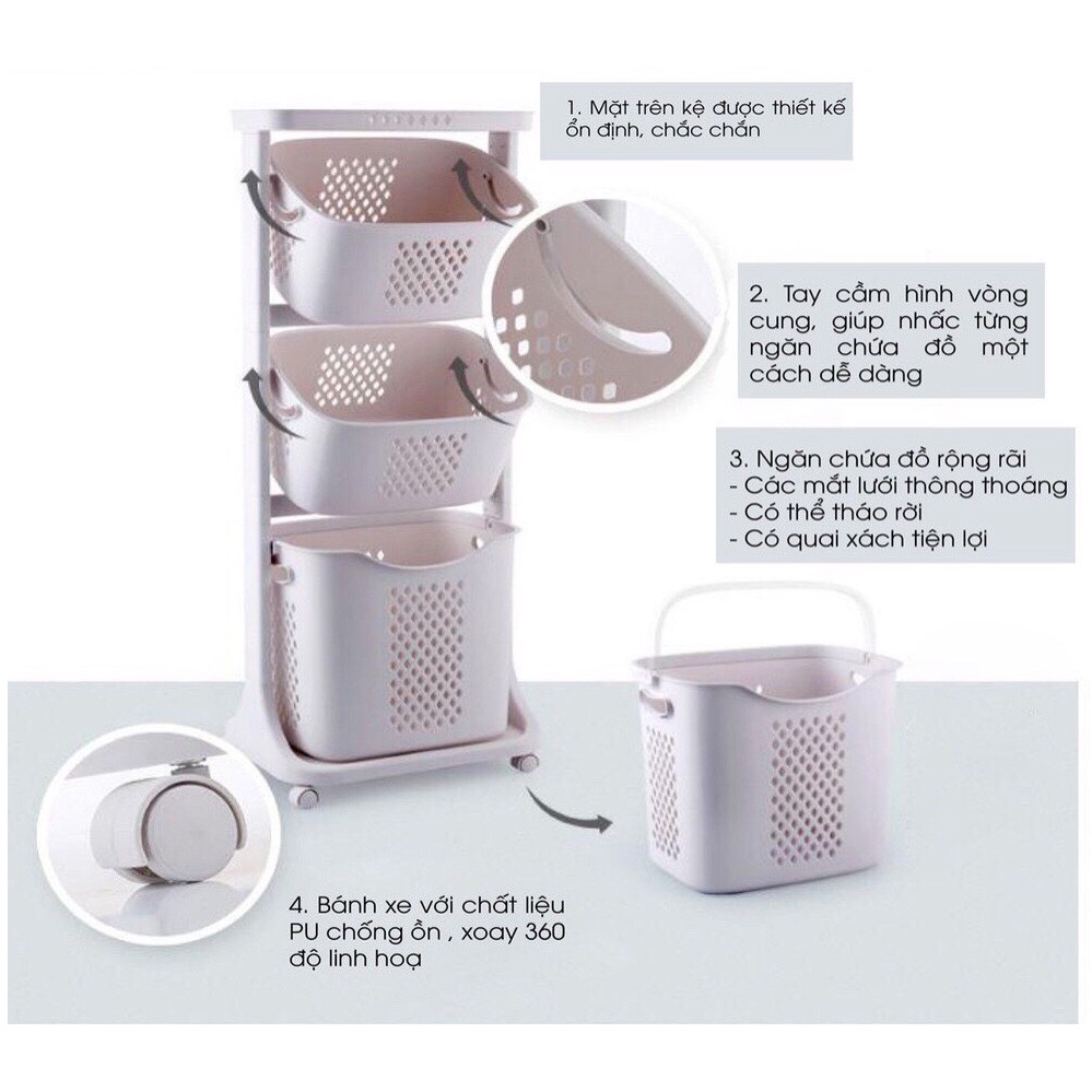 - Kệ gồm 3 tầng, mỗi tàng là 1 chiếc giỏ đựng, riêng giỏ bự nhất ở ngăn cuối có quai xách khi tháo rời có thể dùng làm giỏ đựng đồ tiện lợi.