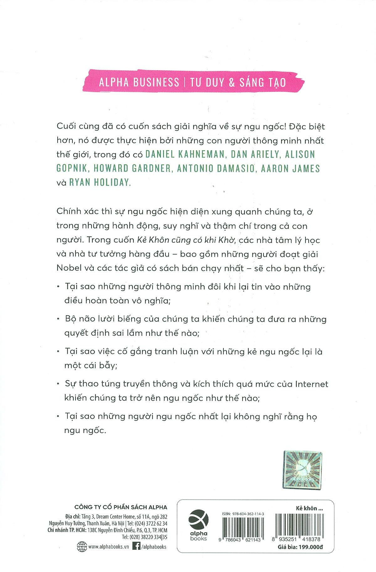 Trong Kẻ khôn cũng có khi khờ, các nhà tâm lý học và nhà tư tưởng hàng đầu – bao gồm người đoạt giải Nobel và các tác giả bán chạy nhất – sẽ cho bạn thấy lý do: tại sao những người thông minh đôi khi lại tin vào những điều hoàn toàn vô nghĩa; bộ não lười biếng của chúng ta khiến chúng ta đưa ra những quyết định sai lầm như thế nào; tại sao cố gắng tranh luận về những kẻ ngu ngốc lại là một cái bẫy; thao túng phương tiện truyền thông và sự kích thích quá mức của Internet khiến chúng ta buồn ngủ như thế nào; tại sao những người ngu ngốc nhất lại không nghĩ rằng họ ngu ngốc. Kẻ khôn cũng có khi khờ kết hợp ý kiến của các chuyên gia về nghiên cứu tâm lý và thần kinh mới nhất với cách tiếp cận trò chuyện đa dạng. CUỐN SÁCH CÓ GÌ ĐẶC BIỆT
