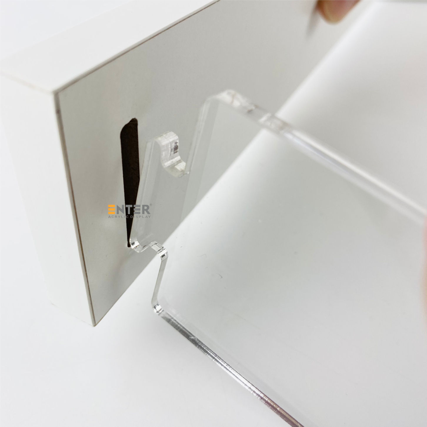 Kệ được làm từ chất liệu gỗ MDF chống ẩm phủ Melamine dễ dàng vệ sinh, bền đẹp kết hợp với mica trong suốt chất lượng cao không bị đục, mờ, rạn nứt, dễ dàng nhìn rõ sản phẩm từ 2 bên.