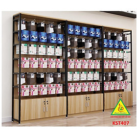 Kệ trưng bày sản phẩm, hàng hóa , kệ trang trí khung sắt mặt gỗ có nhiều kiểu dáng cho khách hàng lựa chọn theo nhu cầu riêng của từng cửa hàng như: