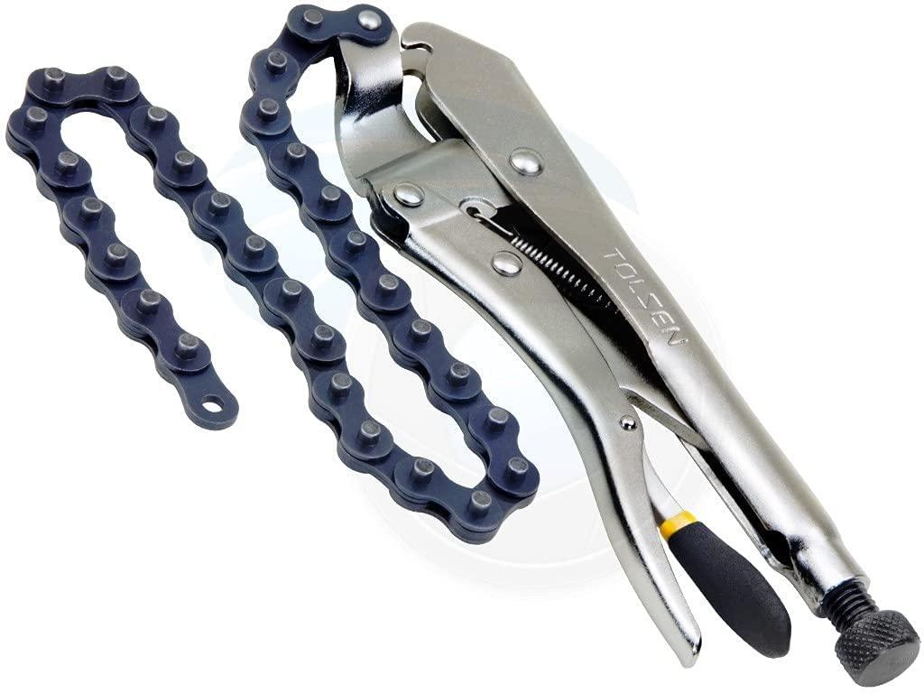 Kềm bấm xích 10 inch Tolsen 10050 là dụng cụ cầm tay chuyên dùng để bấm, kẹp, giữ, tháo mở hoặc vặn siết các loại ống nhựa, tuýp sắt, những vật dụng hình trụ có kích cỡ khác nhau, đặc biệt là các loại ống có đường kính lớn. Tolsen 10050 được làm bằng thép mạ niken, có độ bền cao, chịu lực và chịu nhiệt tốt, không bị biến dạng trong quá trình sử dụng, được dùng rộng rãi trong nhiều lĩnh vực như cơ khí, công nghiệp sửa chữ Kềm bấm xích có kích thước 460mm, thiết kế hiện đại, đơn giản dễ sử dụng, đặc biệt vừa tay, cầm nắm chắc chắn, tạo lực tốt, chất liệu an toàn cho da, đảm bảo sử dụng hiệu quả trong thời gian dài. Sản phẩm có dây xích dài theo cơ chế truyền động giúp dễ dàng tăng hoặc giảm đường kính to, nhỏ phù hợp với vật dụng cần thao tác. Thông số kĩ thuật