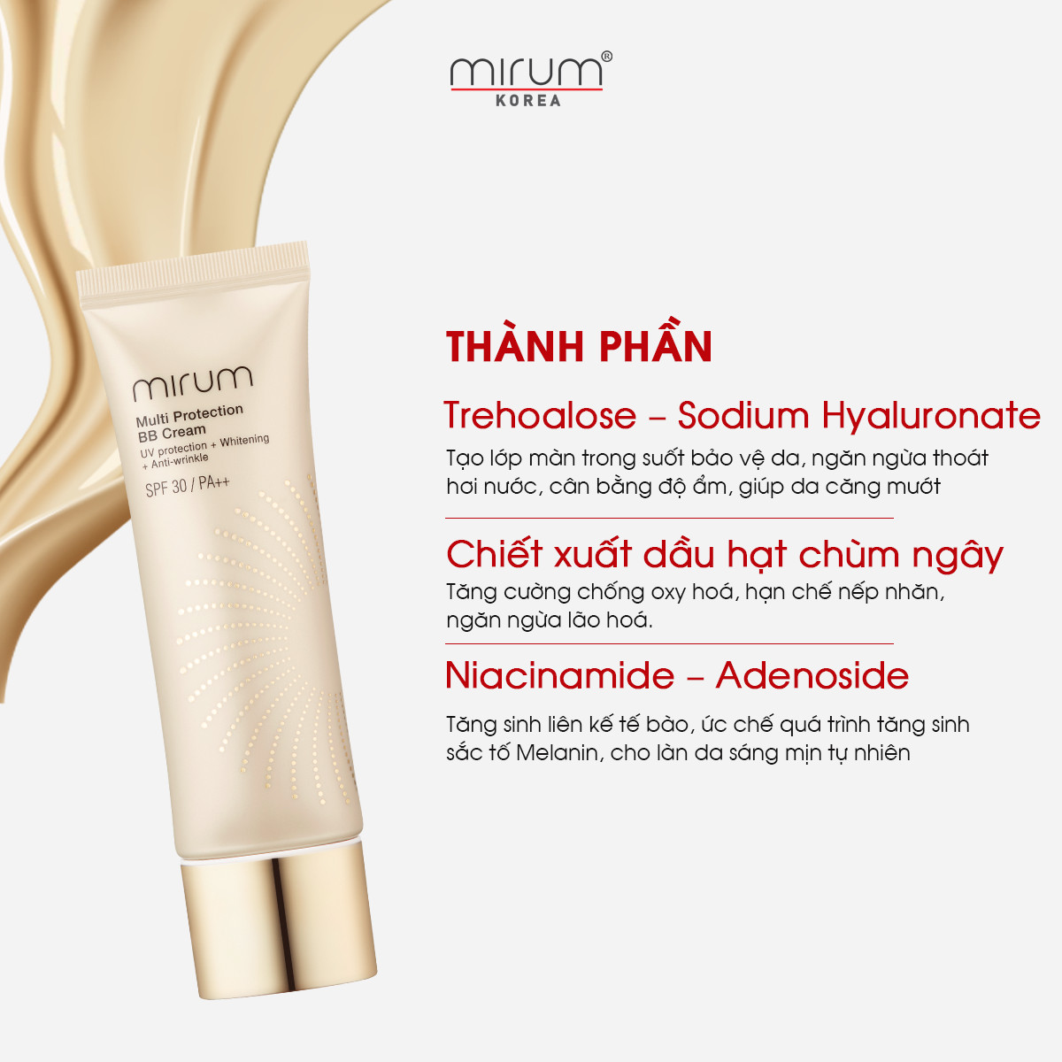 - Niacinamide – Adenoside: Tăng sinh liên kế tế bào, ức chế quá trình tăng sinh sắc tố Melanin, cho làn da sáng mịn tự nhiên. ƯU ĐIỂM NỔI BẬT: Sự lựa chọn của 99% chị em công sở hay những cô nàng bận rộn nhưng muốn có lớp nền căng mịn, che khuyết điểm tốt Kem BB 6in1 Mirum làm trắng da, chống lão hoá, dưỡng ẩm, chống tia UV, Lót và nền sở hữu những công dụng