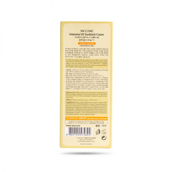 Kem Chống Nắng 3w Clinic Intensive Uv Sunblock Cream Spf 50 Pa+++ 70 Ml Xuất xứ: Korea Hãng sản xuất: 3W Clinic. Dung tích: 70ml Kem Chống Nắng 3w Clinic Intensive Uv có công thức