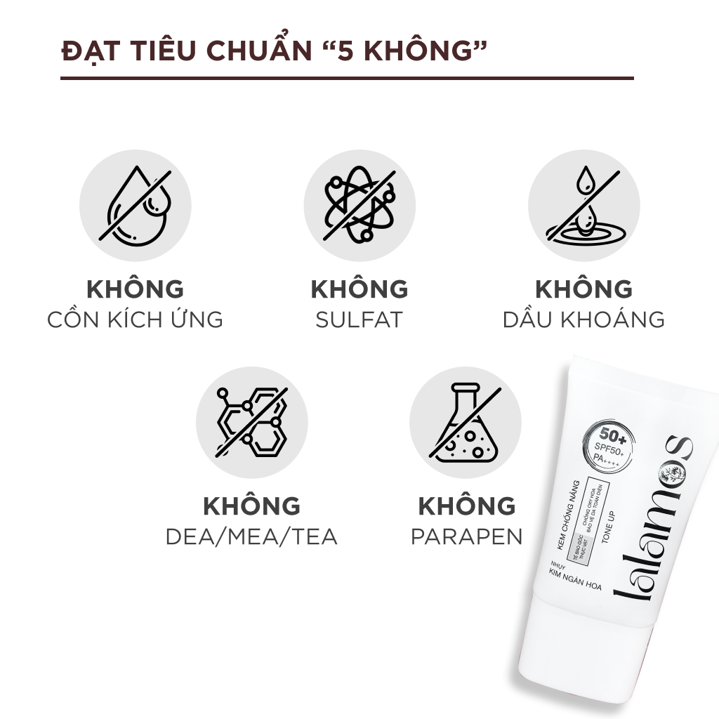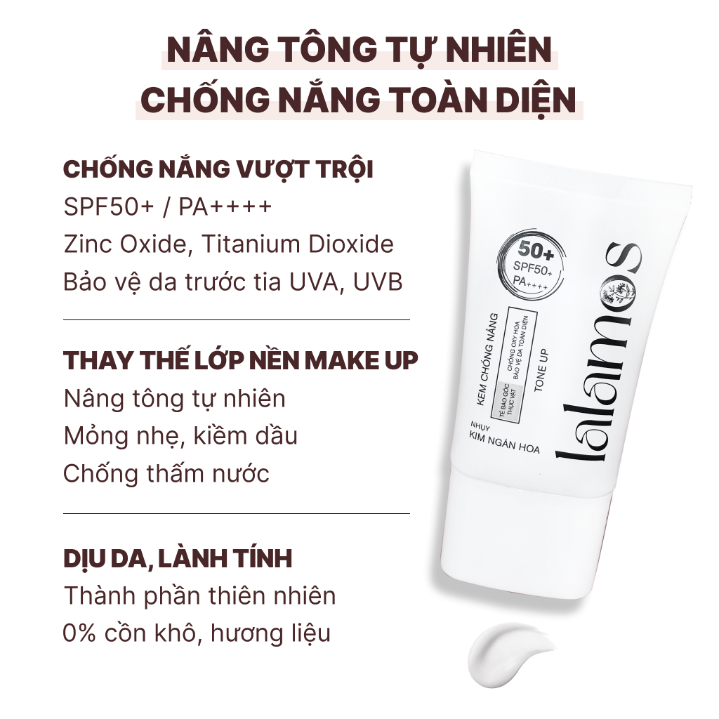 Là sản phẩm lý tưởng để bảo vệ làn da khỏi tác hại của tia UV. Với chỉ số chống nắng cao SPF 50+ PA++++, sản phẩm tạo một lớp màng bảo vệ hiệu quả, ngăn chặn tia UVA và UVB, giúp phòng ngừa các vấn đề về da như nám, tàn nhang và lão hóa sớm. Sản phẩm này khác biệt so với các dòng kem chống nắng trước đây của Lalamos nhờ khả năng nâng tông da trắng sáng tự nhiên, giúp làn da trông khỏe mạnh và tươi mới hơn.