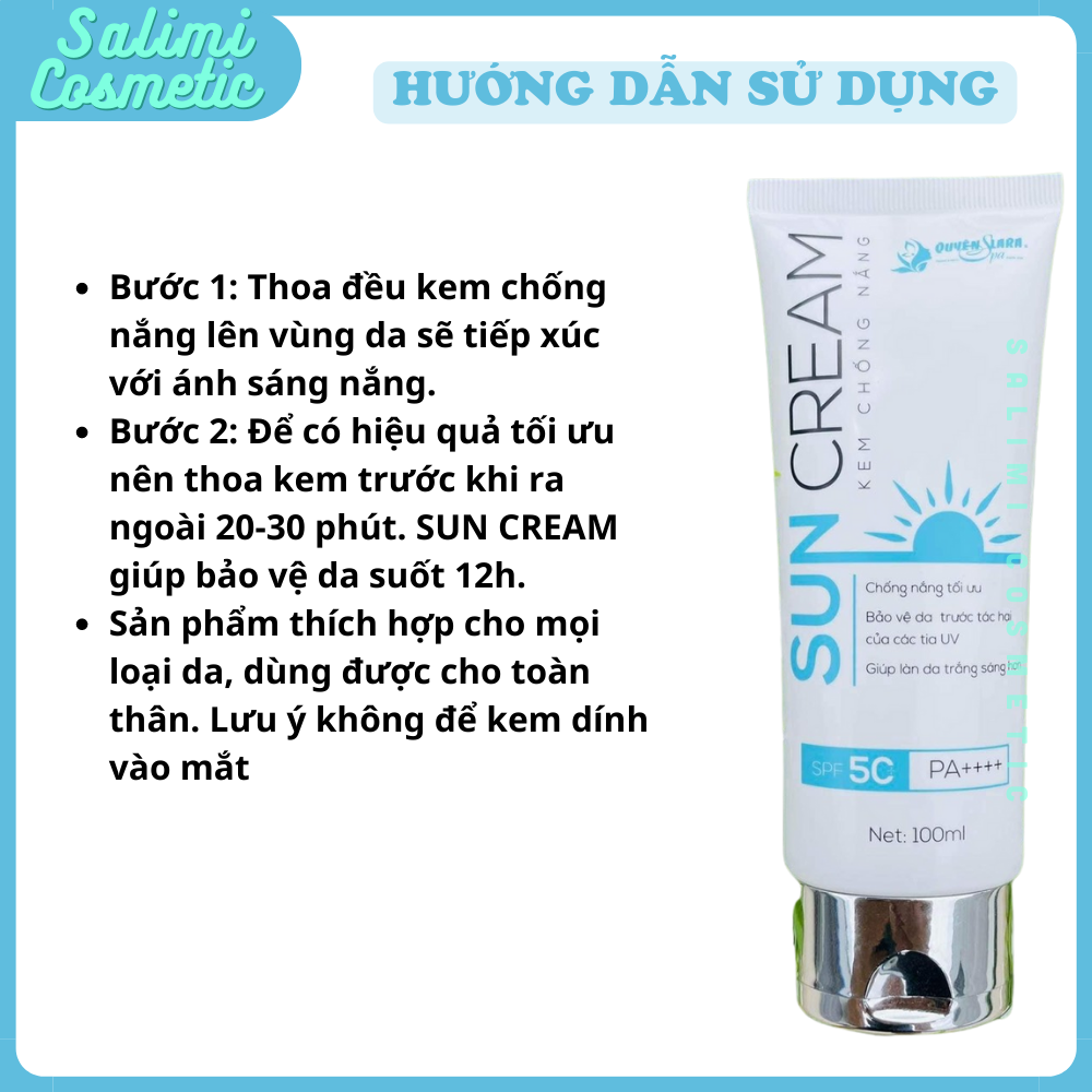CÁCH SỬ DỤNG Bước 1: Thoa đều kem chống nắng lên vùng da sẽ tiếp xúc với ánh sáng nắng. Bước 2: Để có hiệu quả tối ưu nên thoa kem trước khi ra ngoài 20-30 phút. SUN CREAM giúp bảo vệ da suốt 12h. Sản phẩm thích hợp cho mọi loại da, dùng được cho toàn thân. Lưu ý không để kem dính vào mắt