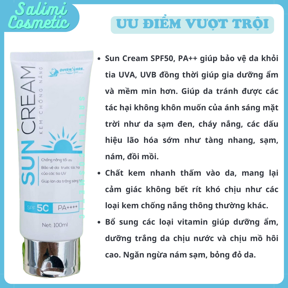Việc thoa lại kem chống nắng vô cùng cần thiết để bảo vệ làn da. Đặc biệt những người hoạt động nhiều ngoài trời. Đối với phái đẹp, sức khỏe làn da là một yếu tố rất được chú trọng nên việc bảo vệ làn da bằng kem chống nắng Sun Cream Quyên Lara là một điều cần thiết cho mọi hoạt động hằng ngày.