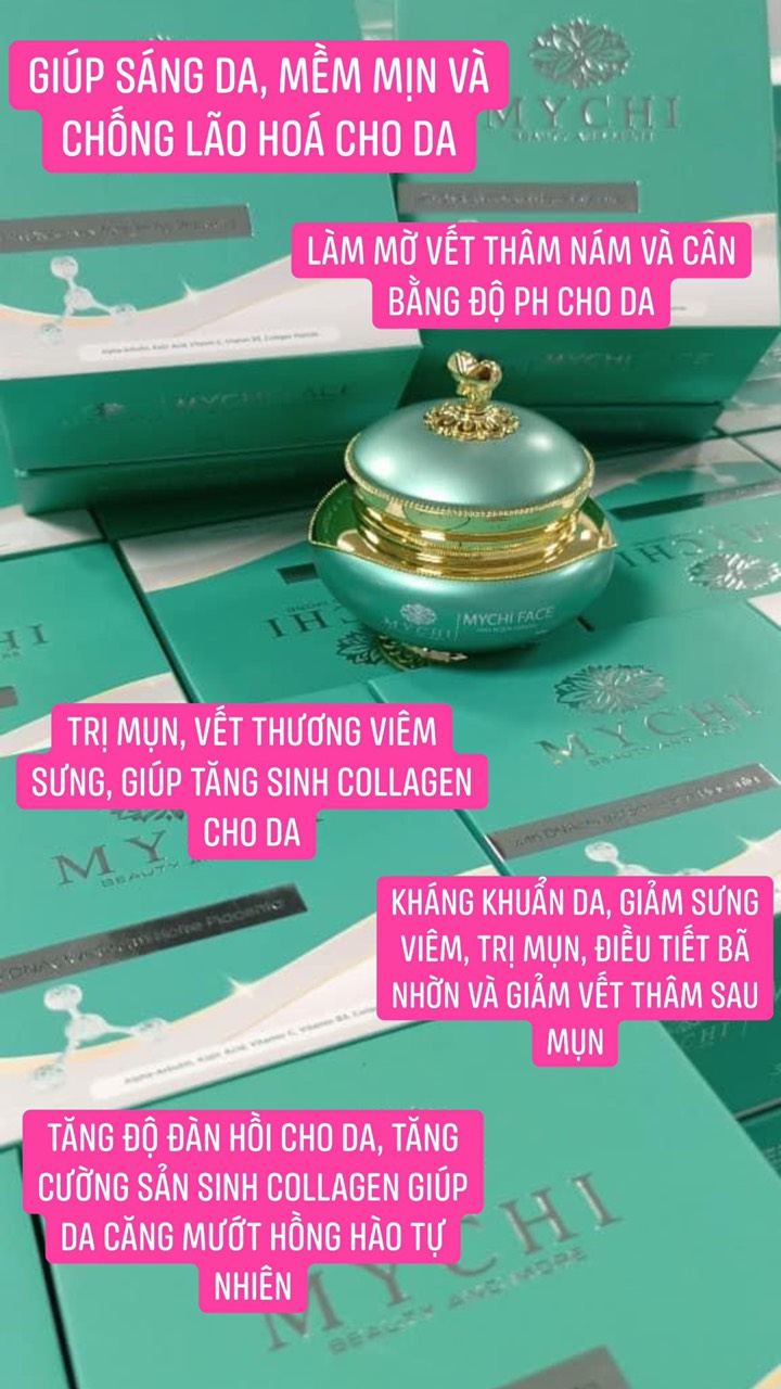- CÔNG DỤNG Chắc trong chị em đây không ai là không muốn bảo vệ da mặt của mình nhỉ. Bài hôm trước chúng ta đã biết về kem chống nắng của MyChi. Hôm nay Mỹ Phẩm MyChi cho ra mắt bộ sản phẩm Kem Face MyChi để giúp da mặt của mình được bảo vệ 1 cách tuyệt đối – Làm trắng da và đều màu da, cấp ẩm cho da. – Tăng độ đàn hồi cho da, tăng cường sản sinh collagen giúp da căng mướt hồng hào tự nhiên – Hỗ trợ ngừa nám, phá huỷ sắc tố melanin gây nám da. làm sáng và dịu da. Có khả năng thẩm thấu sâu ( thẩm thấu đa tầng) vào da giúp làm sáng da đối với các tổn thương do ánh nắng mặt trời có thể nhìn thấy, đốm đồi mồi hoặc sẹo và từ đó cải thiện khả năng chống lão hóa trên da. – Cải thiện sắc tố da tại các điểm bị tổn thương vì sẹo mụn, dưỡng sáng da từ từ nhẹ nhàng hơn, thích hợp với làn da nhạy cảm và kể cả da nhiễm corticoid
