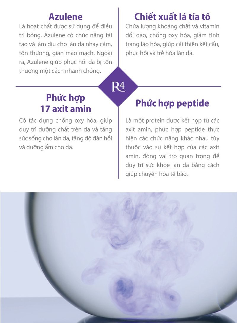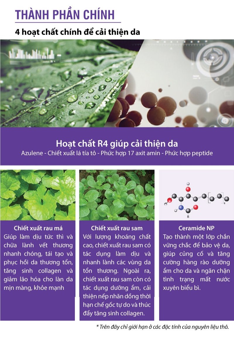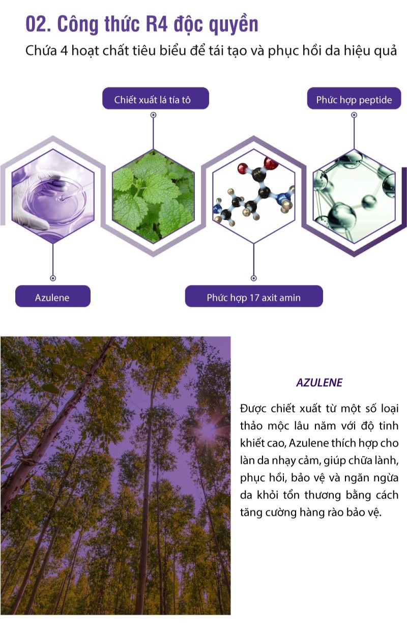 - Đẩy nhanh thời gian phục hồi cho làn da với công thức R4 độc quyền (Azulene: tái tạo và làm dịu/ Chiết xuất lá tía tô: chống oxy hóa, phục hồi và trẻ hóa làn da/ Phức hợp 17 Amino Acid: tăng độ đàn hồi và dưỡng ẩm/ Phức hợp Peptide: kích hoạt sự trao đổi chất của tế bào).