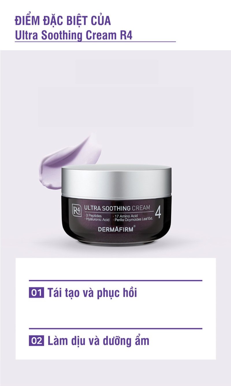 Mua tại Tiktok• VÌ SAO BẠN SẼ THÍCH? Ultra Soothing Hydra Cream R4 là sản phẩm best seller của Dermafirm với lớp kem dưỡng mịn, mượt, nhẹ tênh với công thức độ gồm 4 hoạt chất tiêu biểu để tái tạo và phục hồi da yếu, tổn thương cực kì hiệu quả. • ƯU ĐIỂM NỔI BẬT