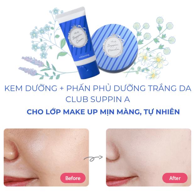 - Được khuyên dùng với Phấn phủ dưỡng trắng da Club Suppin A để để tăng hiệu quả make up, dưỡng da cũng như mang lại cho bạn vẻ ngoài tự nhiên, rạng rỡ hơn. Dành cho da thâm sạm, xỉn màu, tàn nhang. ƯU ĐIỂM NỔI BẬT