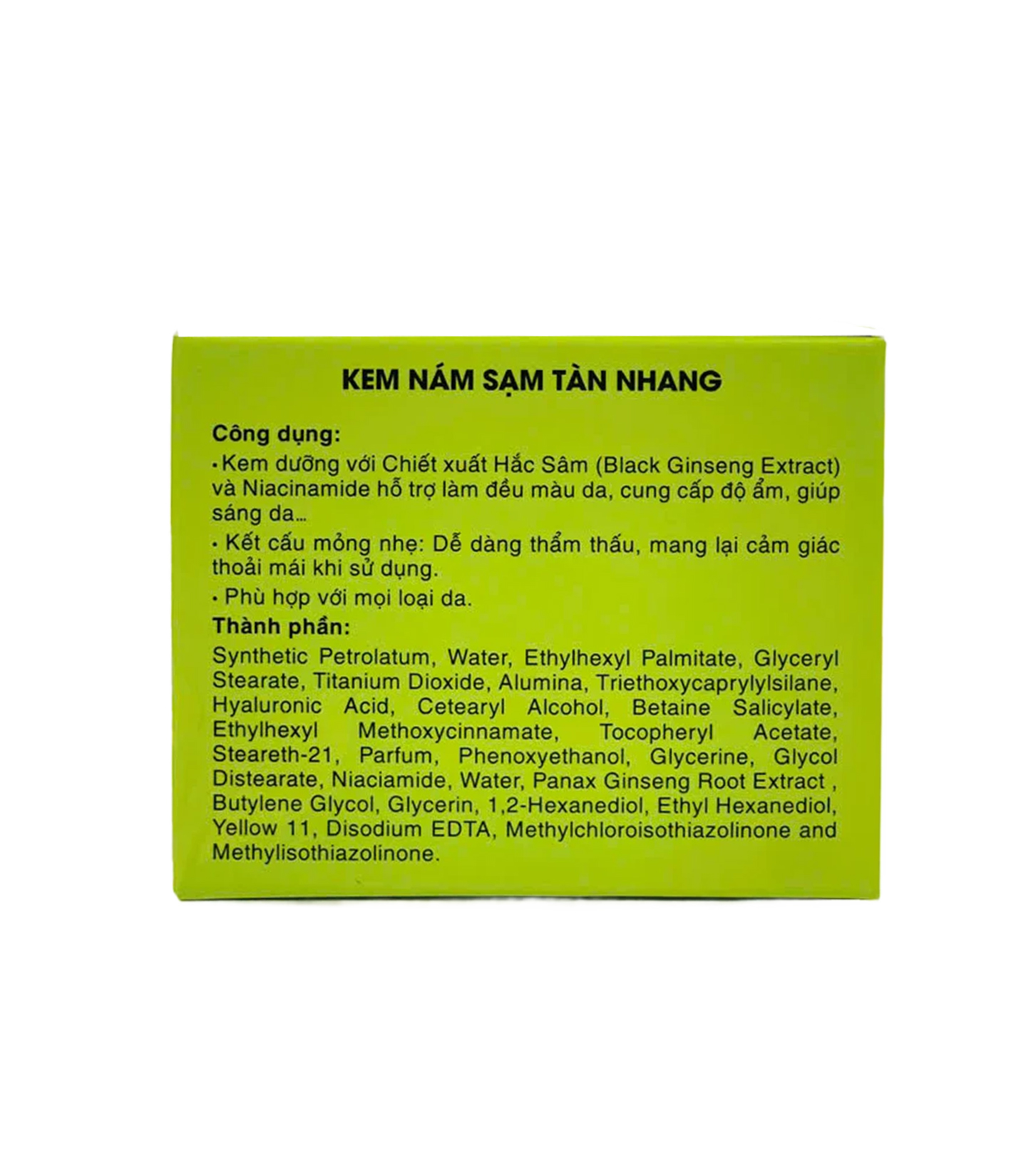 Công dụng: Kem dưỡng với Chiết xuất Hắc Sâm (Black Ginseng Extract) và Niacinamide hỗ trợ làm đều màu da, cung cấp độ ẩm, giúp sáng da… Kết cấu mỏng nhẹ: Dễ dàng thẩm thấu,