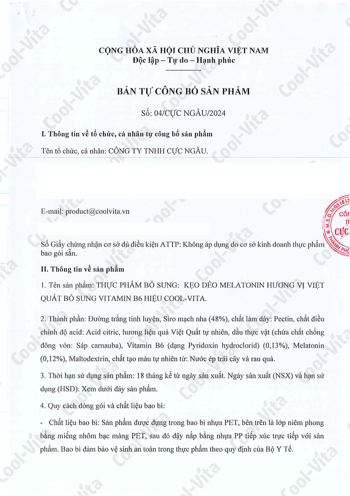 Kẹo Dẻo Melatonin Hỗ Trợ Giấc Ngủ Ngon Sleep Well Gummies & Hỗ Trợ Giảm Căng Thẳng Vị Việt Quất Kết Hợp Vitamin B6 Coolvita – (60 viên x 3g)/hộp vitamind Bạn đang gặp khó khăn khi đi vào giấc ngủ? Vậy thì đừng nên bỏ qua Kẹo Dẻo Melatonin Vị Việt Quất của CoolVita! Kẹo Dẻo Melatonin CoolVita Vị Việt Quất Kết Hợp Vitamin B6 hỗ trợ điều chỉnh chu kỳ giấc ngủ và hỗ trợ cải thiện chất lượng giấc ngủ ngon hơn. Với 6mg melatonin trong mỗi 2 viên kẹo, kết hợp cùng vitamin B6 hỗ trợ giảm căng thẳng, có một đêm ngủ ngon và sâu hơn. Lợi ích nổi bật: Hỗ trợ cải thiện chất lượng giấc ngủ: Mỗi 2 viên kẹo dẻo chứa 6mg Melatonin kết hợp Vitamin B6 hỗ trợ điều chỉnh chu kỳ giấc ngủ tự nhiên, giúp bạn dễ dàng đi vào giấc ngủ và duy trì giấc ngủ sâu suốt đêm. Hỗ trợ giúp thư giãn trước khi ngủ: Vitamin B6 giúp tạo cảm giác thư giãn trước khi ngủ, giúp cơ thể dễ dàng đi vào giấc ngủ. An toàn và lành mạnh: Kẹo Dẻo Melatonin CoolVita không phải là thuốc ngủ, hỗ trợ bạn ngủ ngon hơn. Nguyên liệu từ thực vật: Được làm bằng pectin từ thực vật thay vì gelatin, sản phẩm an toàn cho sức khỏe và phù hợp với chế độ ăn chay.   Đặc điểm sản phẩm: Hương vị thơm ngon: Vị việt quất chua ngọt dễ chịu, kẹo dẻo mềm mịn, ngon miệng, không gây dính răng. Dễ sử dụng: Sản phẩm được chế biến thành dạng kẹo dẻo nhai tiện lợi. Tiện lợi mang theo: Hộp nhựa nhỏ gọn, dễ dàng mang theo khi đi công tác hoặc du lịch.   Thành phần: Đường trắng tinh luyện, Siro mạch nha (48%), chất làm dày (Pectin), chất điều chỉnh độ acid: Acid citric, hương liệu quả việt quất tự nhiên, dầu thực vật (chứa chất chống đông vón: Sáp carnauba), Vitamin B6 (dạng Pyridoxin hydrochloric 0,13%), Melatonin (0,12%), Maltodextrin, chất tạo màu tự nhiên. Nước ép trái cây và rau quả.   Khối lượng tịnh: 180g (60 viên x 3g)   Hướng dẫn sử dụng: